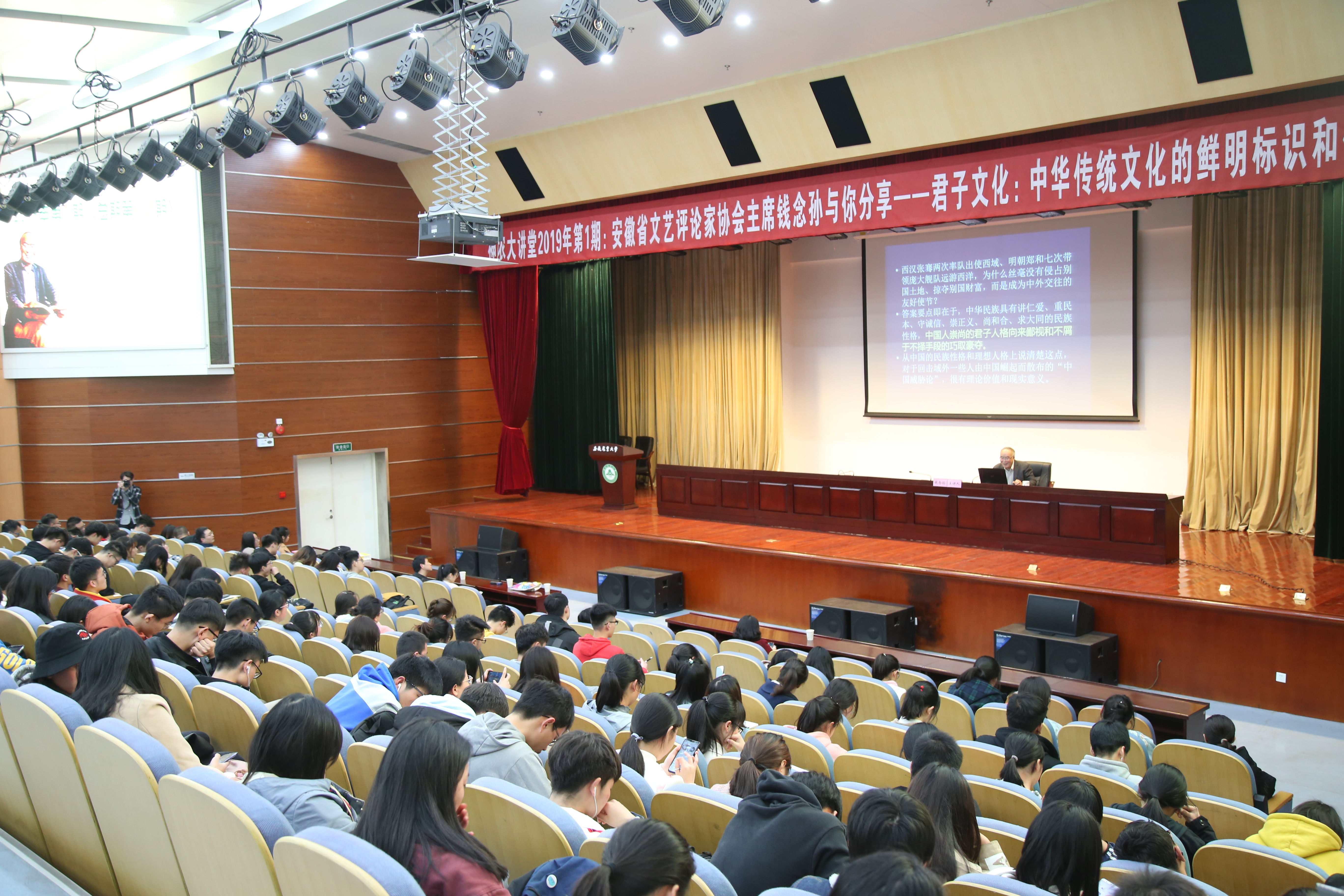 本网讯 3月25日晚,著名文化学者、安徽省文艺评论家协会主席钱念孙研究员做客我校神农大讲堂,在图书馆第一报告厅为师生带来了一场主题为“君子文化:中华传统文化活态嫁接的老树新枝”的讲座,外国语学院党委书记姚莉,校团委副书记任琪、张志平出席了讲座,全校500余名师生聆听了讲座。