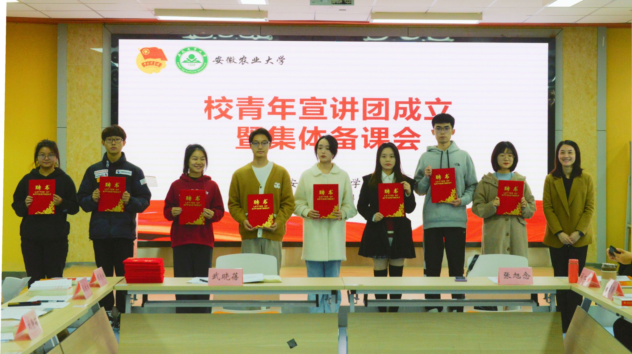 会上,与会领导老师宣读了《关于成立安徽农业大学青年宣讲团的通知》,并为宣讲团成员颁发聘书。会议指出,青年宣讲团成员要学深悟透党的二十大提出的新思想、新论断,全面学习、全面把握党的二十大精神的丰富内涵,加强党的二十大精神的青年化阐释;要将学校贯彻落实举措融入宣讲,传递学校高质量发展、以学生为本的办学理念,激励全体学生团结奋斗;要守正创新,运用“沉浸式”体验、“启发式”教育、“互动式”交流等方式,增强宣讲实效,让广大青年听得进、记得住、用得上;要知行合一、言行一致,树好青年宣讲团形象,做好榜样示范引领。