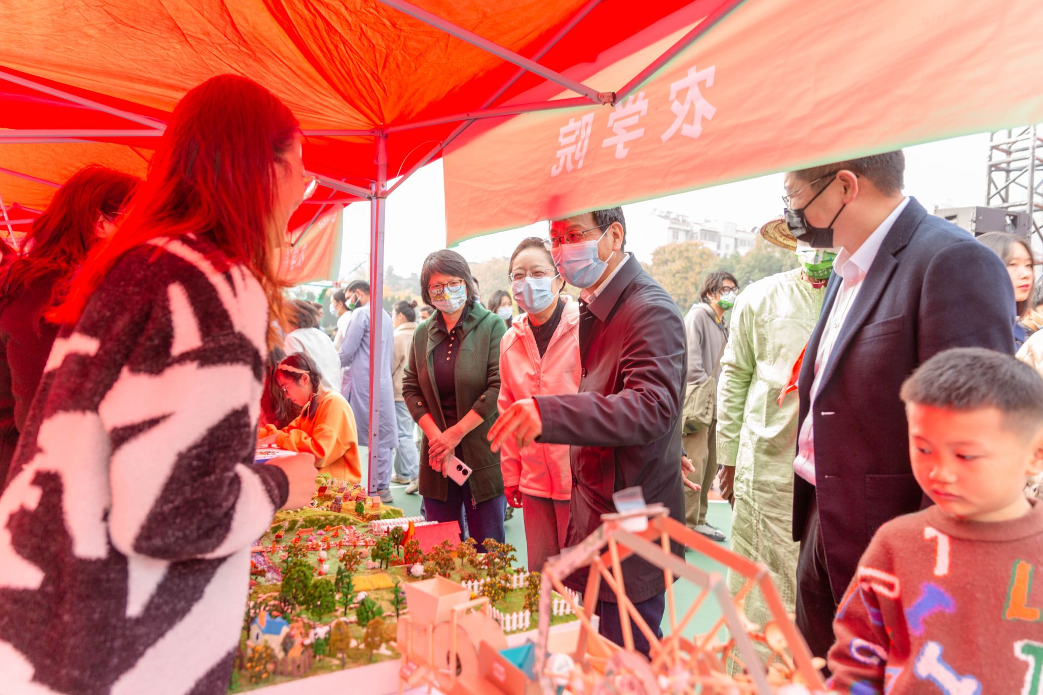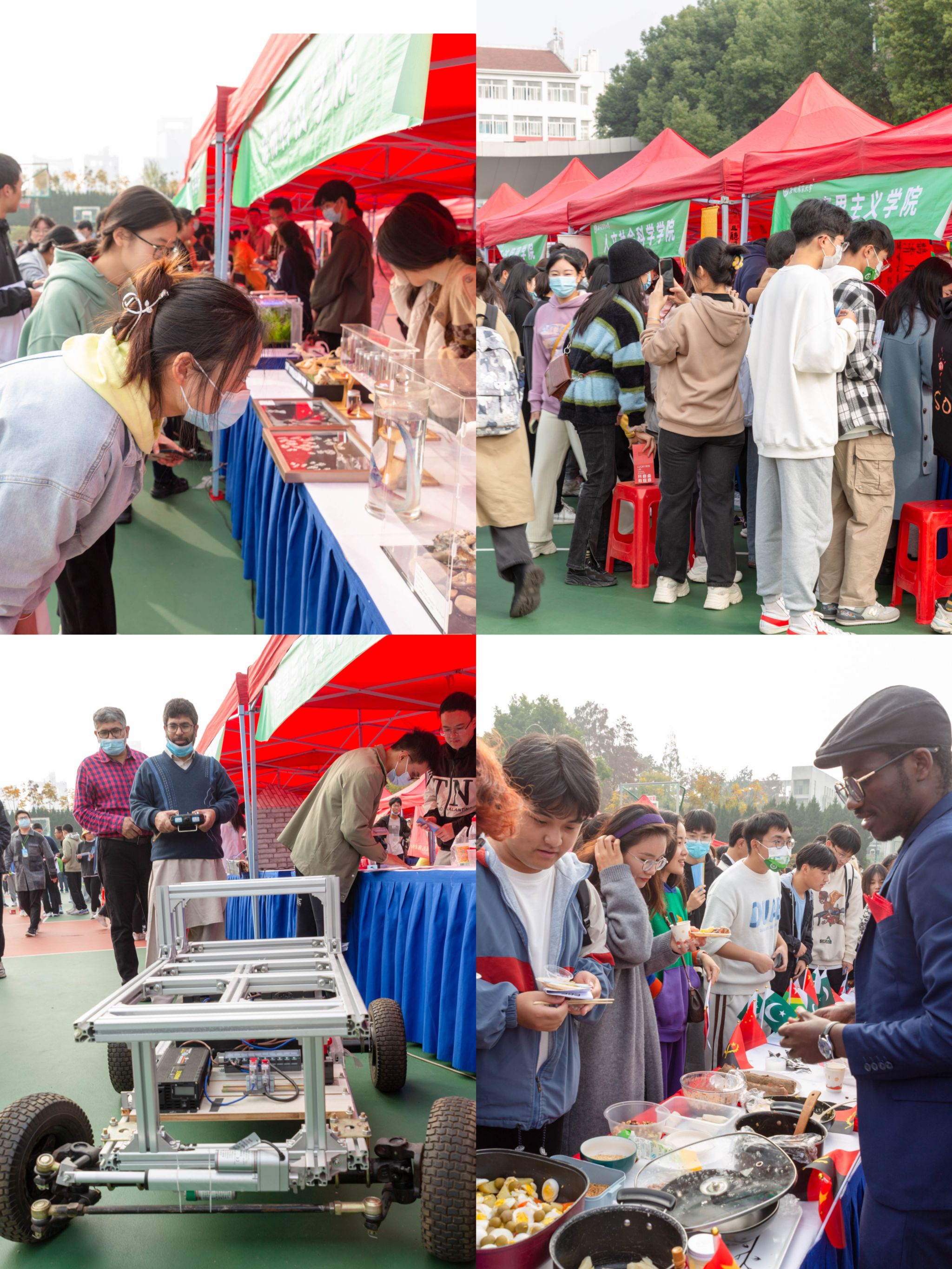 开幕式后,与会领导一同前往各展区观看展览,16个二级学院精心准备了28个农品展台及互动体验项目,既有农具农场模型、二十四节气知识竞答等传统农耕项目,也有动植物标本、插花布艺作品等专业特色项目,更有农业机器人、喷施无人机、智能运输车等现代农业科技展品。国际文化展区集中展示了留学生国家的传统民俗展品和地域特色美食。活动现场,还进行了热火朝天的农趣运动会。