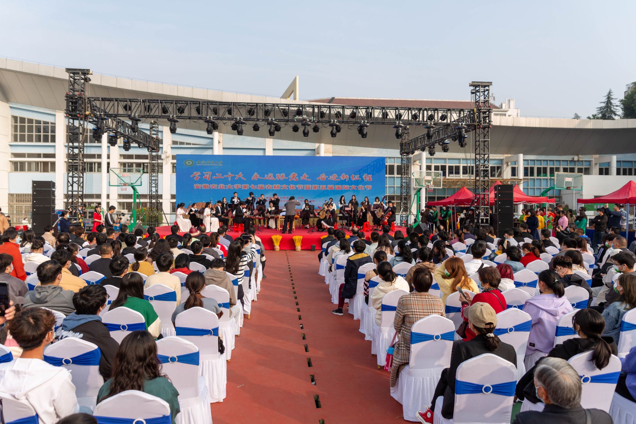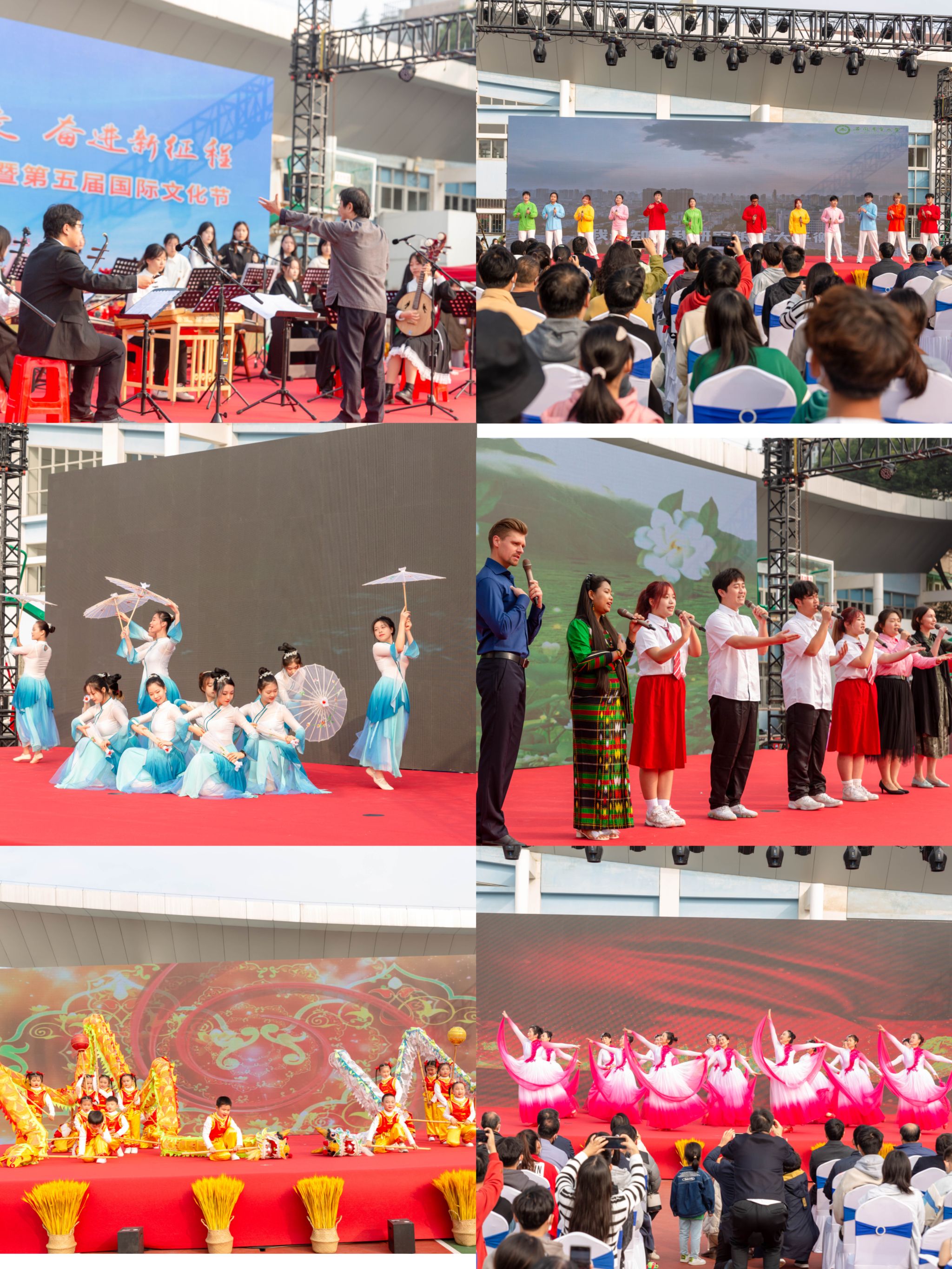 本次活动以“学习二十大 永远跟党走 奋进新征程”为主题。开幕式上,师生们带来了精彩的文艺表演,民乐合奏《丰收锣鼓》展现了秋粮丰收的喜悦,小合唱《最炫农科生》唱出农大学子的赤子情怀,舞蹈《雨涧春行图》描绘出一幅谷雨时节的美妙画卷,幼儿园小朋友们带来的舞龙《龙舞庆丰年》呈现出一派祥和热烈景象,中外学生合唱《茉莉花》传达了深厚的国际友谊,离退休教职工带来的舞蹈《百年再起航》歌颂党的光辉历史,更是将活动推向了高潮。