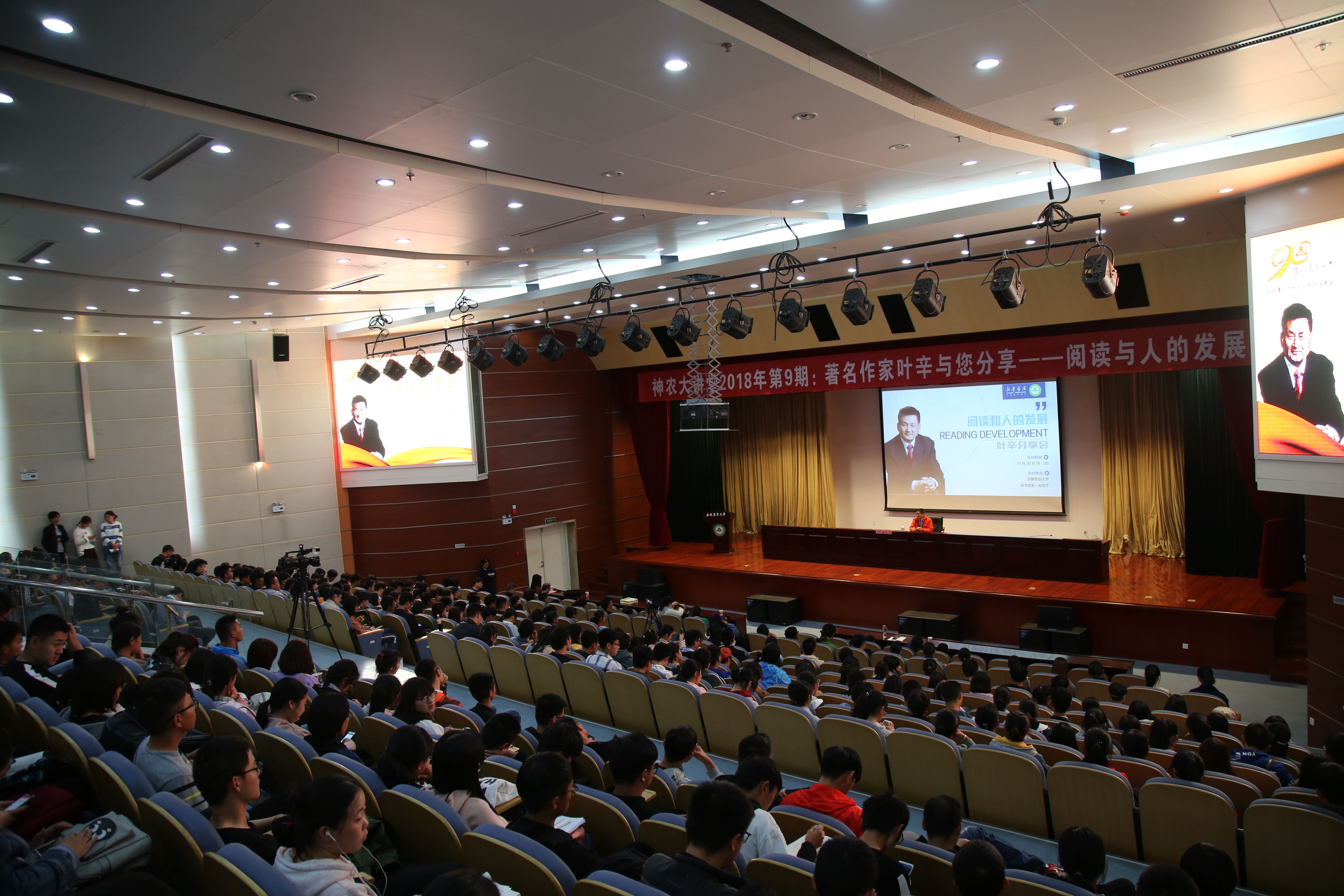 本网讯 10月26日晚,著名作家、中国作家协会副主席叶辛做客我校庆祝建校90周年系列报告会——2018年第9期“神农大讲堂”,在我校图书馆第一报告厅为我校师生带来了一场主题为“阅读与人的发展”的精彩讲座,现场近600名师生一同聆听了讲座。