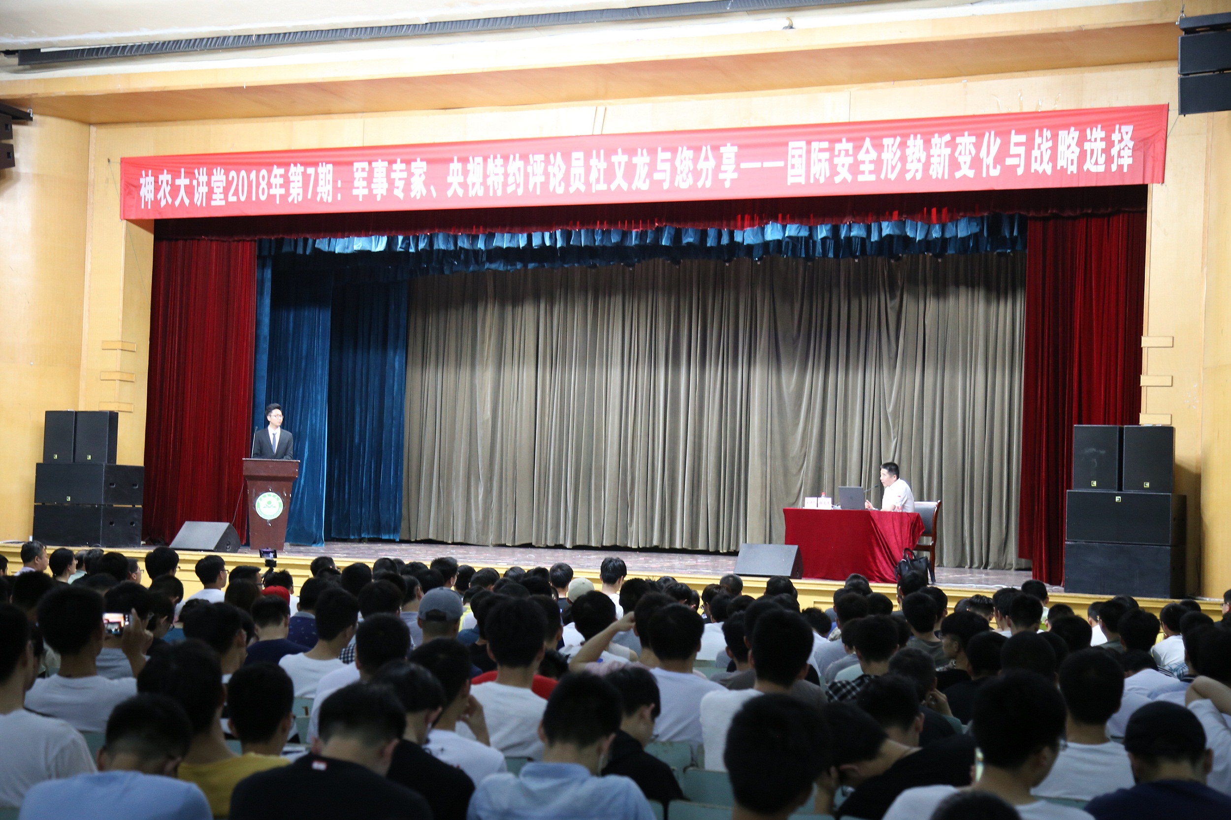 本网讯 6月1日晚,军事专家、央视特约评论员杜文龙教授做客我校庆祝建校90周年系列报告会——2018年第7期“神农大讲堂”,在校大礼堂为我校师生带来了一场主题为“国家安全形势新变化与战略选择”的精彩讲座。校党委组织部部长周旭、办公室主任刘凯、招生就业处处长刘海涛、武装部部长涂德润、外国语学院党委书记姚莉、校工会副主席吴冬梅、工学院党委副书记孙福、校团委副书记任琪出席讲座,现场近2000名师生一同聆听了这场讲座。