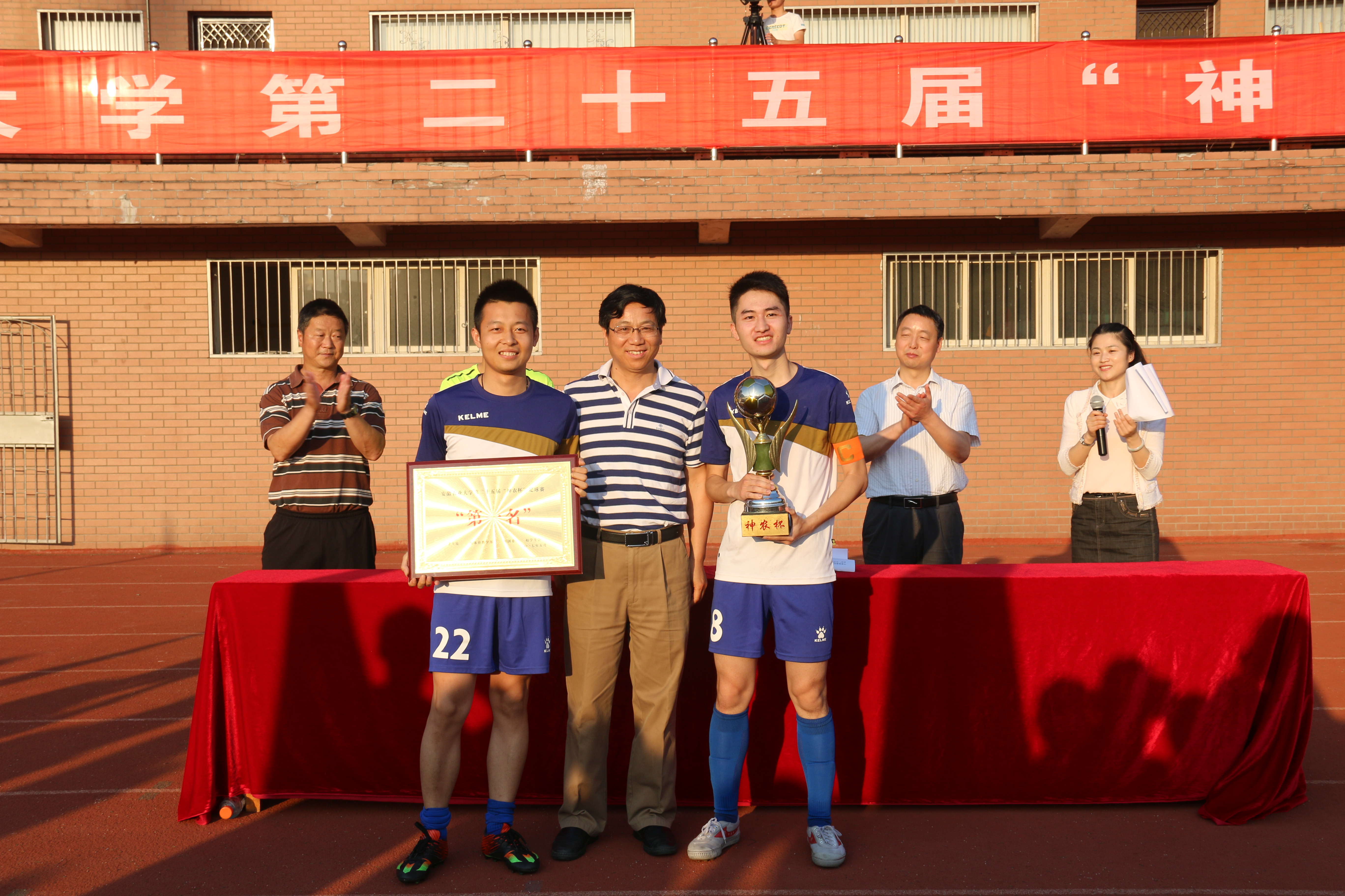 本网讯 5月19日下午,我校第二十五届"神农杯"足球赛在校第一运动场落幕。校纪委书记裴树东、学生处处长彭庆刚、体育部主任陈有忠、校团委副书记任琪,本届“神农杯”足球赛裁判长詹新平老师出席了闭幕式并为本届比赛的获奖集体和个人颁奖。