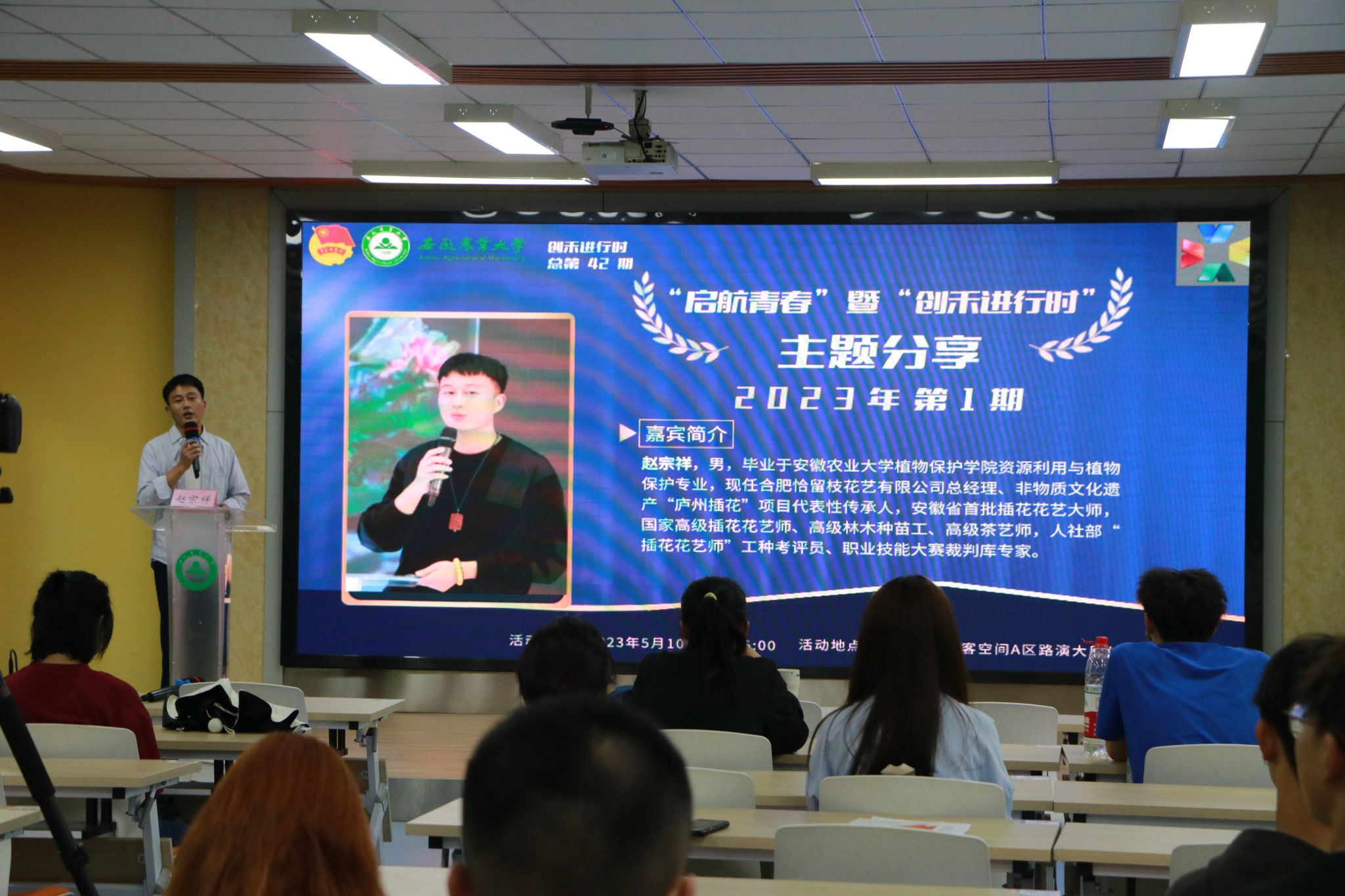 本网讯 5月10日下午,我校“启航青春”暨“创禾进行时”主题宣讲活动在大学生创客空间A区路演大厅顺利举办。活动邀请了我校就业引航员、植物保护学院资源利用与植物保护专业校友、合肥市恰留枝花艺有限公司总经理、非物质文化遗产“庐州插花”项目代表性传承人赵宗祥进行主题宣讲。入驻创客空间的创业团队以及对创新创业实践感兴趣的同学共200余人参与。