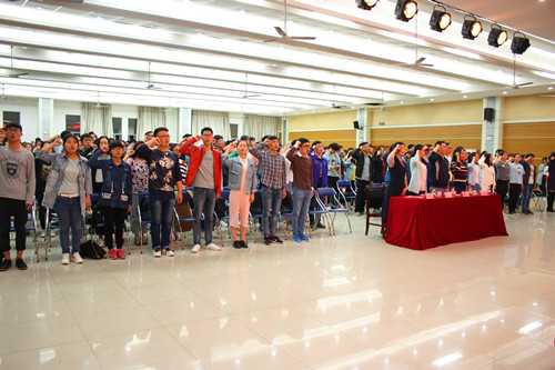 团日活动在一场激情澎湃的朗诵《少年中国说》中拉开序幕。接下来,领导老师分别对2016年度全国活力团支部及我校2016年度红旗团支部、学生干部三风建设典型、2017年校“青马班”优秀学员、校第26期团干部培训班优秀学员进行表彰。活动过半,在鲜艳的团旗下,校学生会副主席何松同学带领大家宣誓,近三百名共青团员攥紧右拳,庄严宣誓,自愿加入中国共青团!青春誓言,激情豪迈,铮铮誓词响彻云霄。