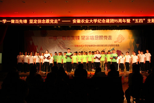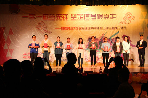 本网讯 今年是中国共青团建团95周年,为深入开展共青团“一学一做”教育实践,引导和帮助学子重温中国共青团的光辉历史,坚定广大青年永远跟党走的信念。5月2日晚,由校团委主办,校学生会等四个学生组织承办的一学一做当先锋 坚定信念跟党走——安徽农业大学纪念建团95周年暨“五四”主题团日活动在欣苑四楼学生活动中心开展。校团委副书记任琪及相关老师、校学生会等四个学生组织团支部近300名同学出席活动。整场活动分为表彰大会、重温入团誓词和文艺汇演三个环节。