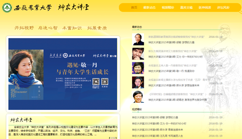 本网讯 近日,我校“神农大讲堂”专题网站正式上线,全校师生登陆“神农大讲堂”专题网站(网址:http://djt.w1.ahau.edu.cn或点击校团委安农青年网站链接)便可以在校内网随时观看往期精彩视频。“神农大讲堂”专题网站的开通实现了大讲堂的线上线下一体化构建模式,提高了讲堂线下资源的利用率,更有效弥补了因为时间冲突、场内观众人数受限等因素影响给师生们带来的缺憾,也给全校师生打通了网上获取讲堂资源信息和完整线下体验的渠道,进一步扩大了讲堂的覆盖面,提升了讲堂的影响力。