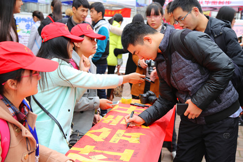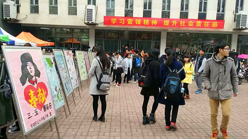 3月4日一早,在校欣苑广场上,来自各学院和学生社团的雷锋日主题海报林立,展示了我校各类志愿服务活动所取得的丰富成果,吸引了众多同学驻足观看。各级团学组织开展的学雷锋活动月活动也在广场上接受报名咨询工作。雷锋正能量表情包设计、美化校园、志愿事迹话剧表演比赛、观看雷锋精神主题电影等活动的展台宣传前,人头攒动,同学们报名热情空前高涨,据了解,所有活动均在3月4日中午12:00前全部报满。与此同时,现场的签名活动也备受瞩目,同学们纷纷在“学习雷锋精神 提升社会责任感”的横幅上郑重签名。这不是一个简单的签名,更是一份承诺:学习雷锋精神,从小事做起,从我做起,立足校园,服务社会,雷锋能做的我们每个人都能做!