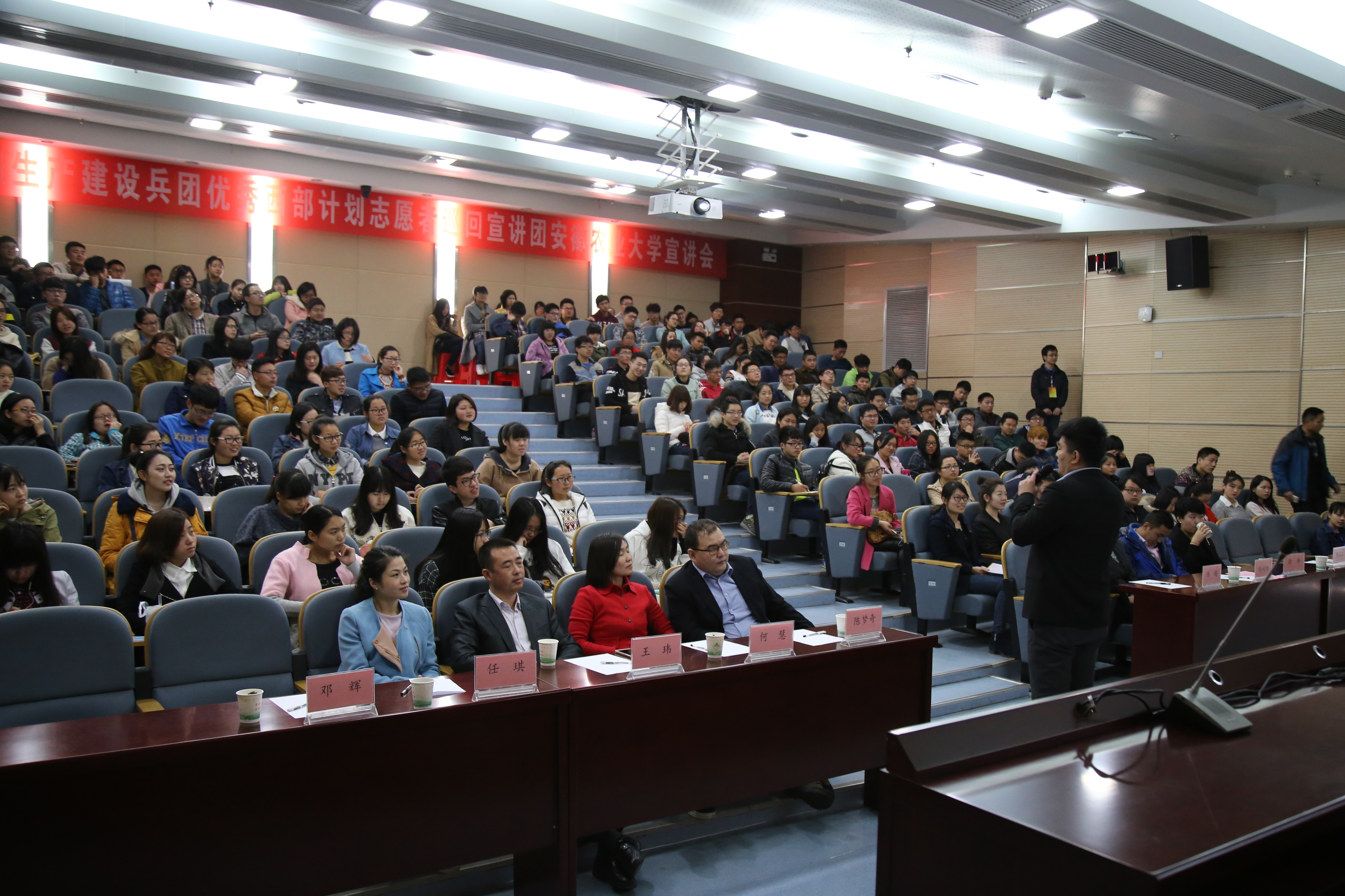 本网讯 3月27日上午,2016年大学生志愿服务西部计划新疆生产建设兵团优秀志愿者事迹宣讲会在我校图书馆第二学术报告厅举行。来自新疆生产建设兵团的西部计划优秀志愿者们分享了他们服务新疆、奉献基层的心得感悟。新疆生产建设兵团第三师、第十三师团委,团省委学校部、我校团委、各院系基层团委有关负责人以及学生代表200余人参加了宣讲会。