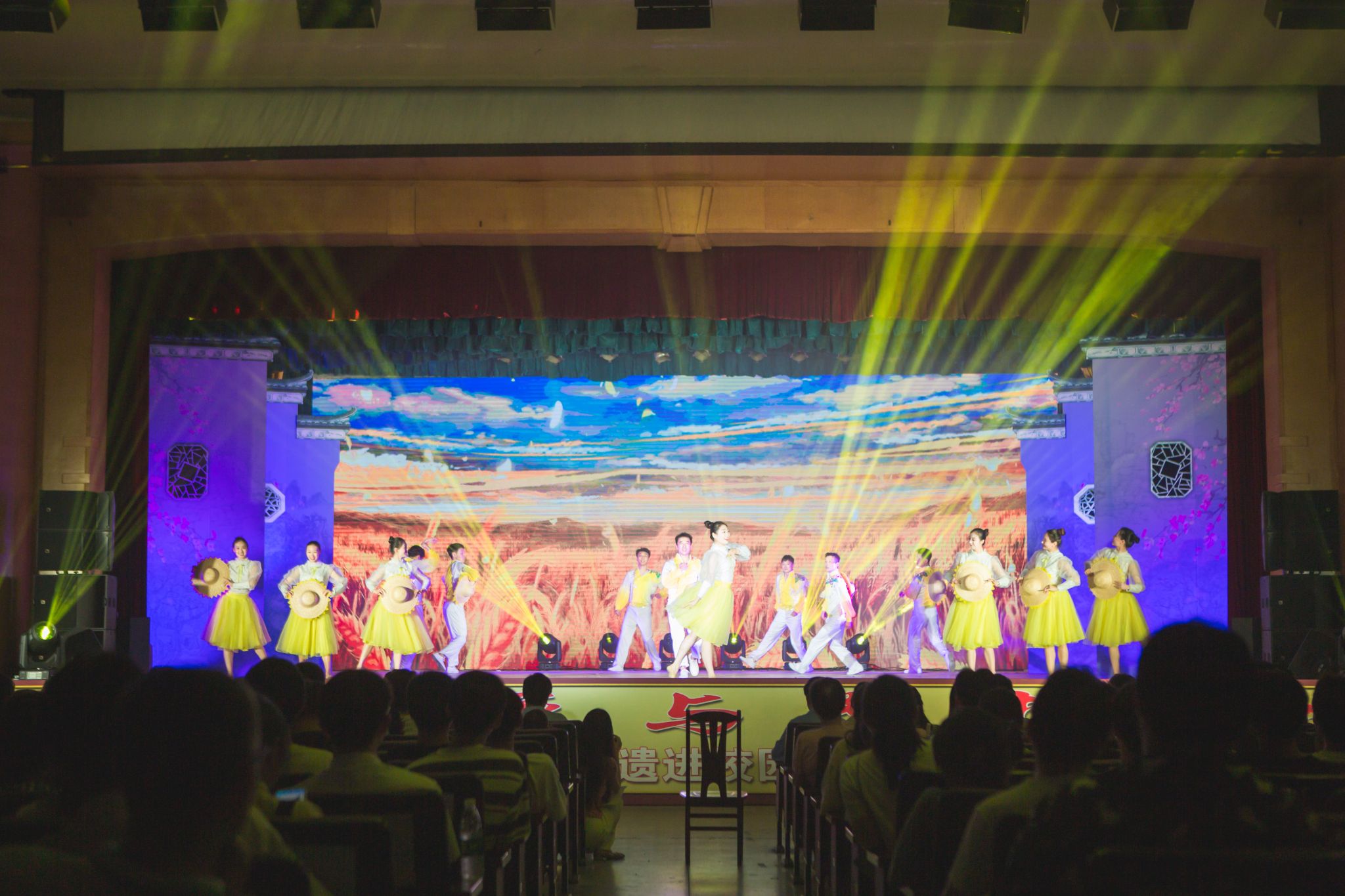 当晚,还举办了由文化名家、非遗传承人和我校师生联袂参演的“传承与梦想”专场文艺演出。演出在《希望的田野上》的歌声中拉开帷幕。歌舞《乡村有戏》将乡土气息与现代街舞巧妙结合。《赞歌高唱二十大》通过快板形式,轻松活泼地描绘出老百姓生活中的真实暖心变化。舞蹈《难忘那盏灯》带着观众重新回顾了小岗村“改革创新、敢为人先”的激荡精神。融合了歌舞、器乐演奏、茶艺表演的《绿水青山》带人走进了书画里的安徽。现代京剧《沙家浜》选段“祖国的好山河寸土不让”,激发起现场学生赓续先烈精神、不忘民族复兴的使命感。歌舞《种子》让全体师生一起向中国杂交水稻事业开创者袁隆平院士致敬。情景剧《贴心人》由我校胡承霖教授的真实经历改编而来,展示出他献身“三农”的感人情怀。歌舞组合《绿浪滚滚迎面来》《未来我来》《远征》唱出了美丽中国火热欢腾的节奏。舞蹈《雨涧春行图》舞出了梦想启航的希望。杂技《力顶千钧》展示出震撼人心的力量与技巧。戏曲《徽黄皖韵》用高亢的徽剧和动听的黄梅戏,唱出了大美安徽的魅力。演出在《梦在春天如愿》的歌声里结束,整场演出气氛热烈,台下掌声不断。