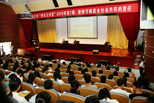 仪式结束后,安徽省粮食局副局长杨增权做客我校神农大讲堂,在图书馆第一报告厅作题为《爱粮节粮是全社会共同的责任》的讲座。讲座由党委副书记李恩年主持。