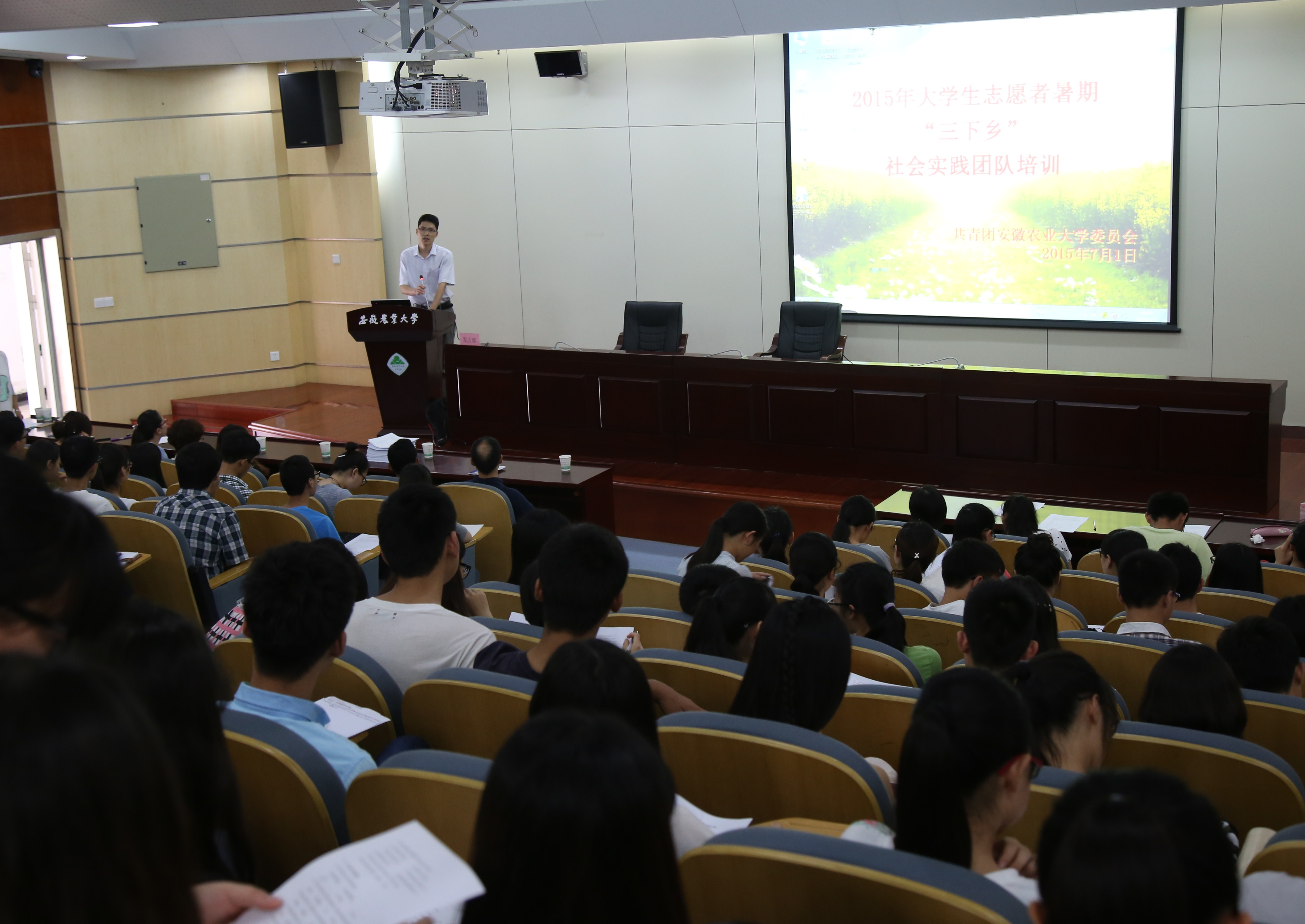 本网讯 7月1日下午,以“践行大别山道路精神、争做‘四有’安农人”为主题的2015年暑期“三下乡”社会实践活动启动仪式暨培训会在图书馆二号报告厅举行。校院两级110个社会实践团队代表参加了培训会。
