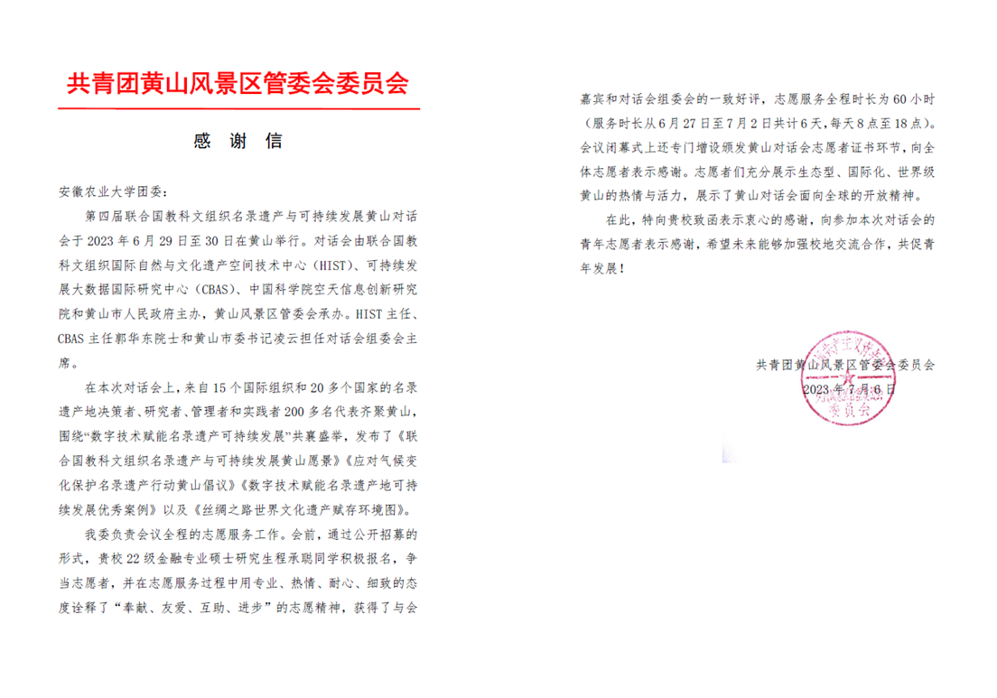 近日,校团委收到了来自共青团黄山风景区管委会委员会的感谢信。信中,对我校2022级金融专业硕士研究生程承聪同学在参加第四届联合国教科文组织名录遗产与可持续发展黄山对话会中的出色表现表示赞许,并对我校的支持表达感谢。