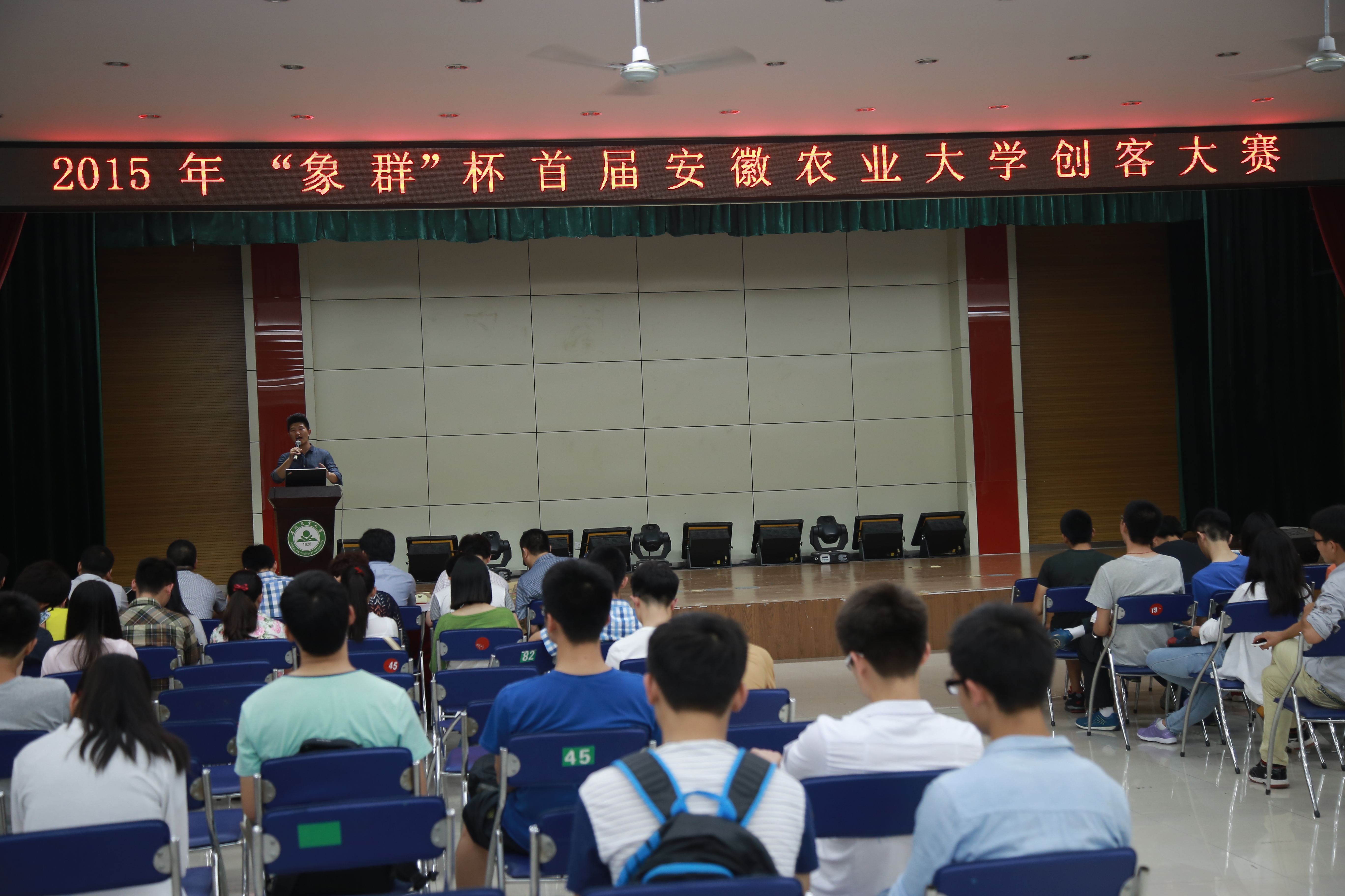 本网讯 5月28日晚,2015年“象群”杯首届安徽农业大学创客大赛在学生活动中心落下帷幕。合肥国家大学科技园发展有限责任公司总经理张大鸣、安徽农业大学团委副书记张健,以及安徽投资俱乐部、安徽迪信通、安徽蜜思肤化妆品、合肥黄山大厦KK餐饮、安徽象群众创空间等企业负责人出席并担任决赛路演评委。安徽农业大学团委相关老师、部分学院团委老师、各参赛创客团队同学以及部分创客爱好者共100余人参加了决赛。