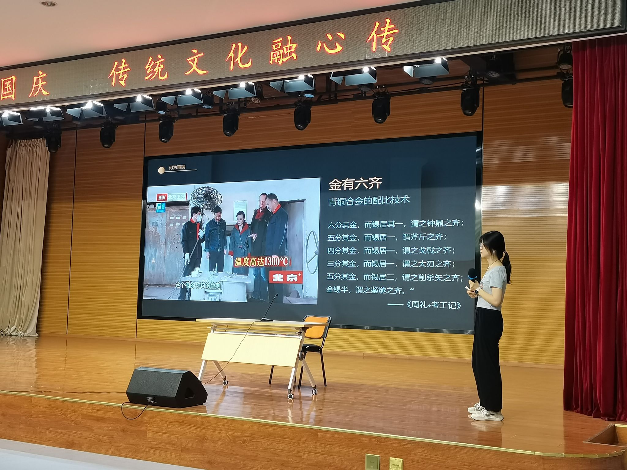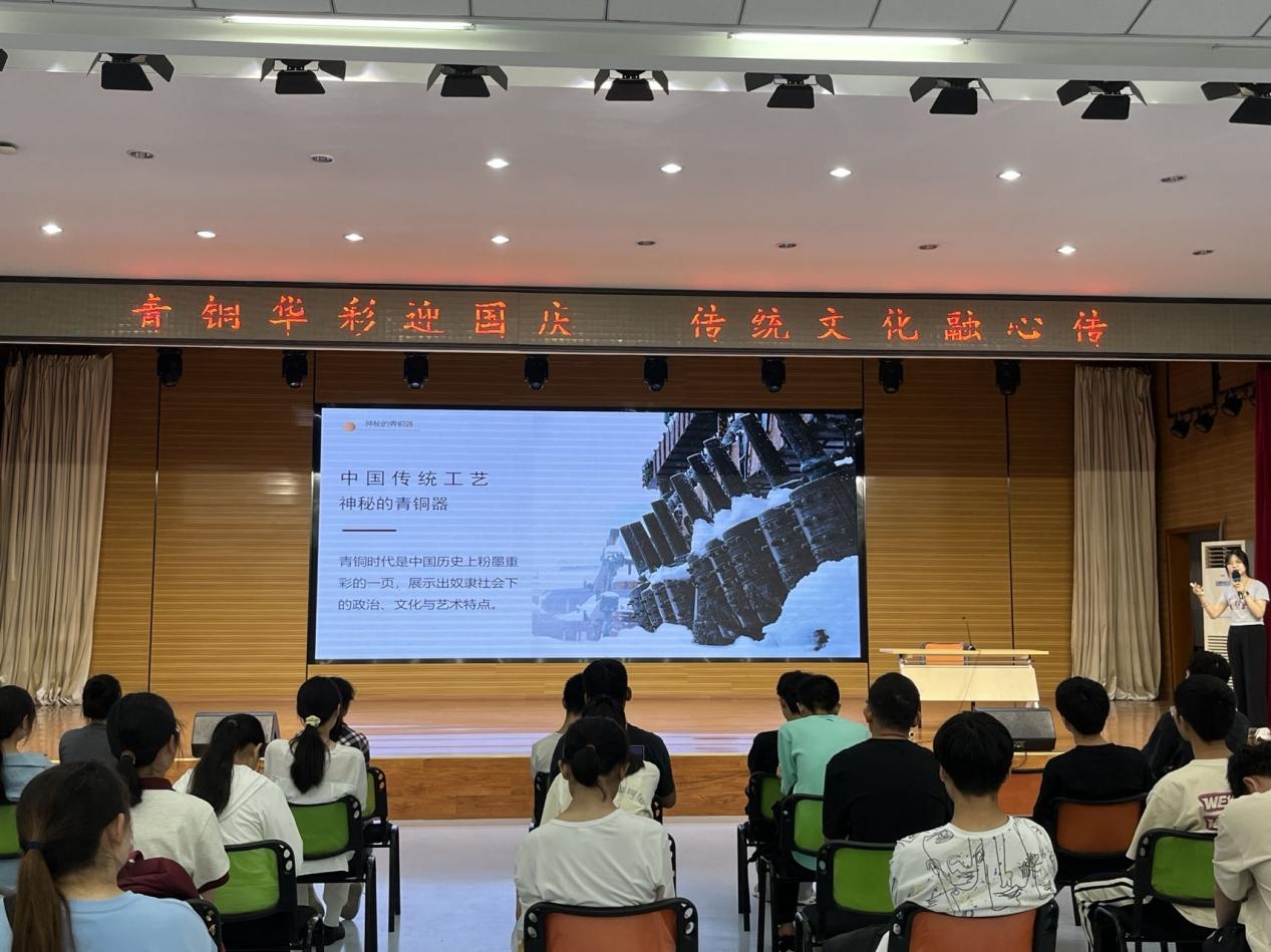 青铜器作为中国古代文明的代表之一,它不仅是古人们生产生活的重要工具和装饰品,更是中国古代文化的重要载体和精神标志,承载着厚重的历史记忆。在中秋佳节、祖国华诞到来之际“美育大讲堂”为学生带来一次传统文化的视听盛宴,旨在用优秀传统文化浸润学生心灵,陶冶学生情操,增强文化自信,营造校园美育文化氛围。