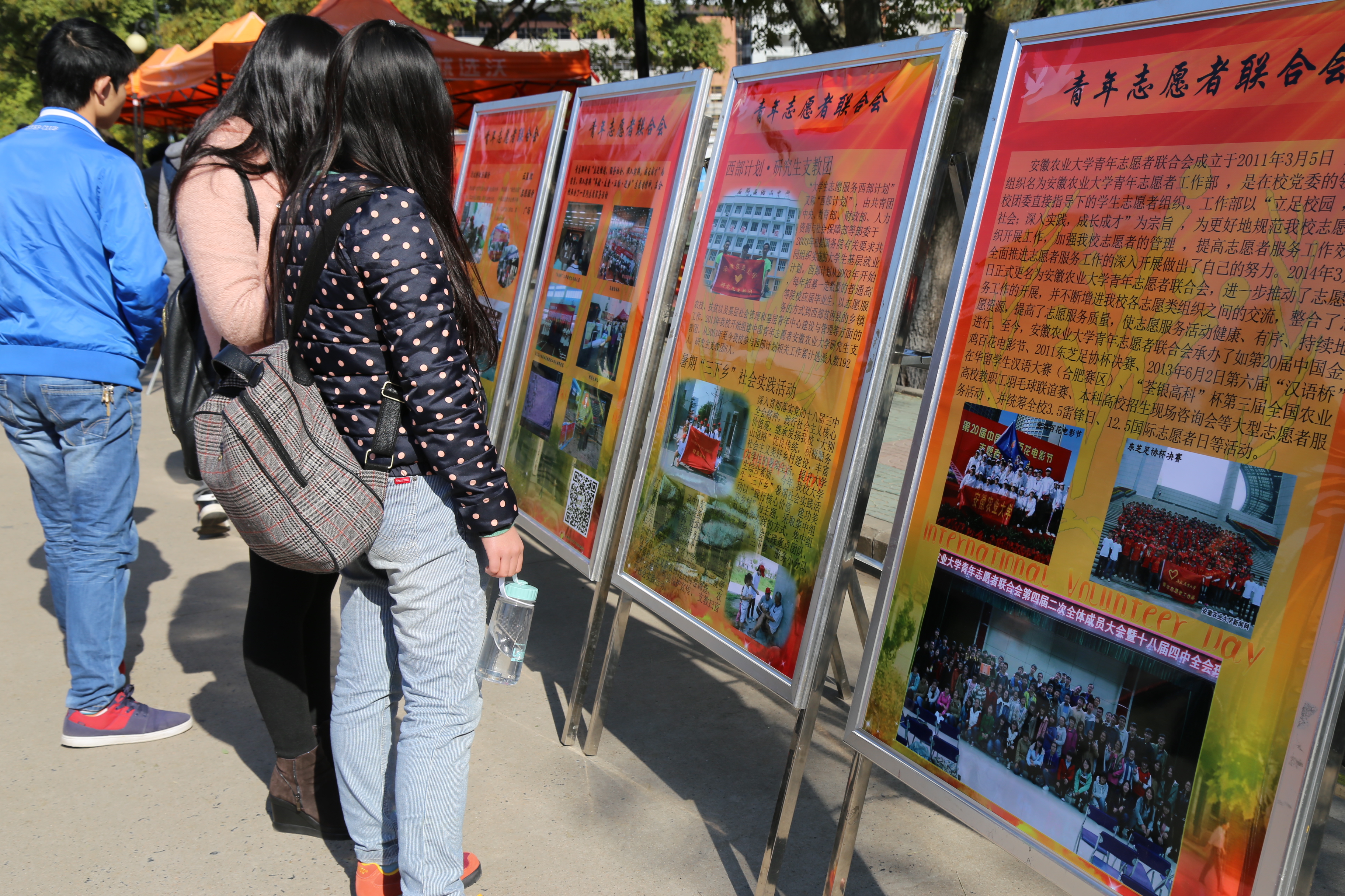 在大礼堂门前,同学们利用平面媒体展示了校内外丰富多彩的志愿服务活动,伴随着一首首感人的奉献歌曲的音乐声,引得同学们驻足观看,活动现场洋溢着奉献的青春气息。创行协会的“走进残疾人群”活动,通过亲身体验让更多的同学及老师感受残疾人生活的不便,关注弱势群体,用实际行动践行志愿服务精神。当天下午,植物保护学院的“春蕾计划”的小学生们也来到了活动现场,观摩我校志愿服务活动,她们纷纷立志做一名优秀的志愿者。
