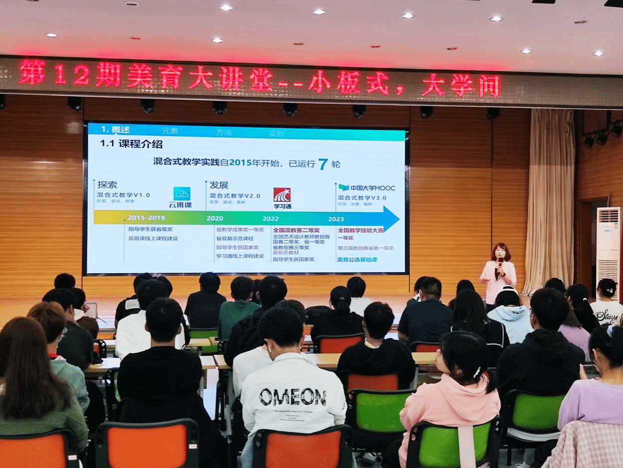 本网讯 10月11日下午,第十二期美育大讲堂在欣苑四楼小礼堂开展,本次讲堂以“小板式,大学问”为主题,由校文化艺术设计中心副主任张玮老师主讲,相关学院的学生参加。