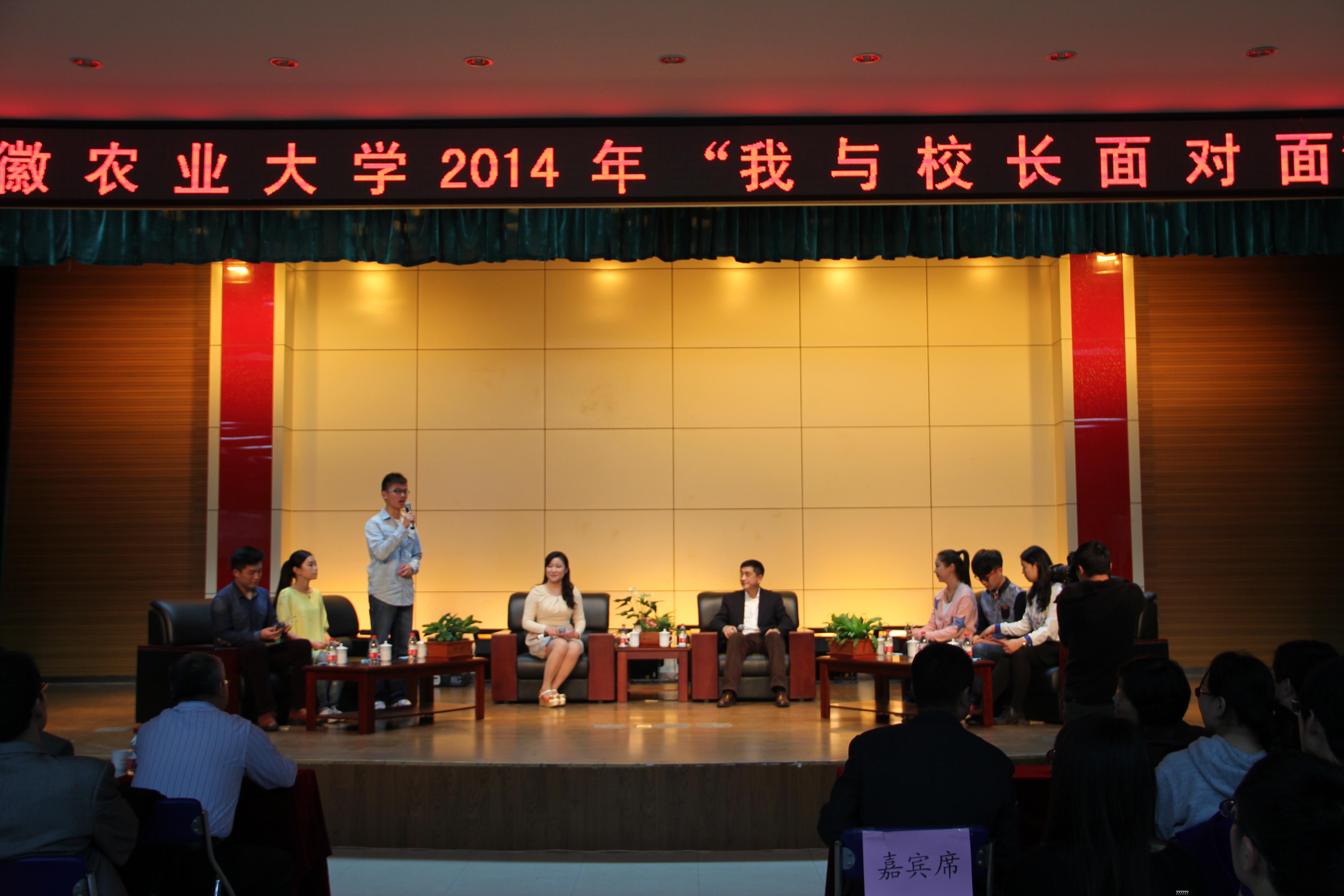 “时间都去哪儿了?”、“对农大‘家风’的理解。”“未来谁来种地?”六名来自不同学院不同年级专业的的学生代表分享自己对焦点问题的见解。宛晓春也兴致勃勃的畅谈自己的体会。“我越来越感觉到时光飞逝,我的时间白天是分配给校长这个岗位,作为教授晚上及周末时间在实验室指导研究生做科研。对于同学们来说,要合理利用自己的时间,有人生梦想、职业规划,还要有追求和行动,坚定执着地去实现梦想。”宛晓春说,“农大的家风就是校风,不仅包括学风、考风、教风,还应包括我们全体教职员工的作风、积极向上的精神风貌、良好的校园文化积淀。86年的办学历史,一代代农大人接续努力,形成了“大别山道路精神”,对于安徽的地方经济和国家的‘三农’事业,做出了应有的贡献。我的梦想是学生要做‘有诚信、有自信、有能力、有责任’的农大人,教师要崇尚学术、鼓励创新、宽容失败、尊重对手,管理工作者和后勤人员要爱岗敬业、用心服务,校园文化要形成健康的、良好的生态环境,使得师生在我们的校园里愉快的工作和学习,健康的生活。”在谈到“未来谁来种地”时,宛晓春指出,针对城镇化发展、现代农业发展的问题,学校的人才培养一直坚持与社会需求对接,主动呼应“三农”事业发展的需要,回答好“谁来种地”这个问题。农大学生要学好专业知识,做规模农业、做现代农场主,要了解农村、农民,要有长远的眼光、伟大的理想,做“三农”事业的传人。