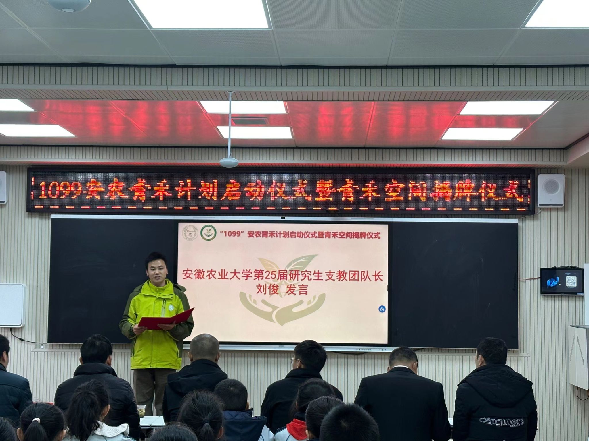 本网讯 为推进安徽农业大学研究生支教团品牌化建设,将安农大学科优势、科技成果、信息资源带到1099公里外的服务地,我校第25届研支团在石阡县实验小学举行“1099”安农青禾计划启动仪式暨青禾空间揭牌仪式。县教育局、团县委、各支教学校相关负责同志出席活动,贵州省少工委副主任周晓群、安农大校团委书记武晓蓓发来视频致辞。