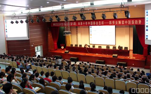 本网讯9月24日下午,清华大学经济学教授、中央电视台《百家讲坛》和《名家论坛》主讲嘉宾韩秀云应邀做客我校2013年第5期神农大讲堂,与师生分享题为《未来十年中国将会怎样》的精彩报告。报告会由校团委书记刘海涛主持,近500名师生到场聆听。