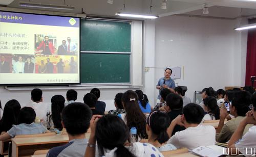 本网讯 为提升我校主持人的业务技能,6月4日晚,在勤学楼129多媒体教室,安徽广播电视台经济广播《在路上》栏目制作人兼主持人北海来我校为同学们做了一场《活动主持技巧》的培训。