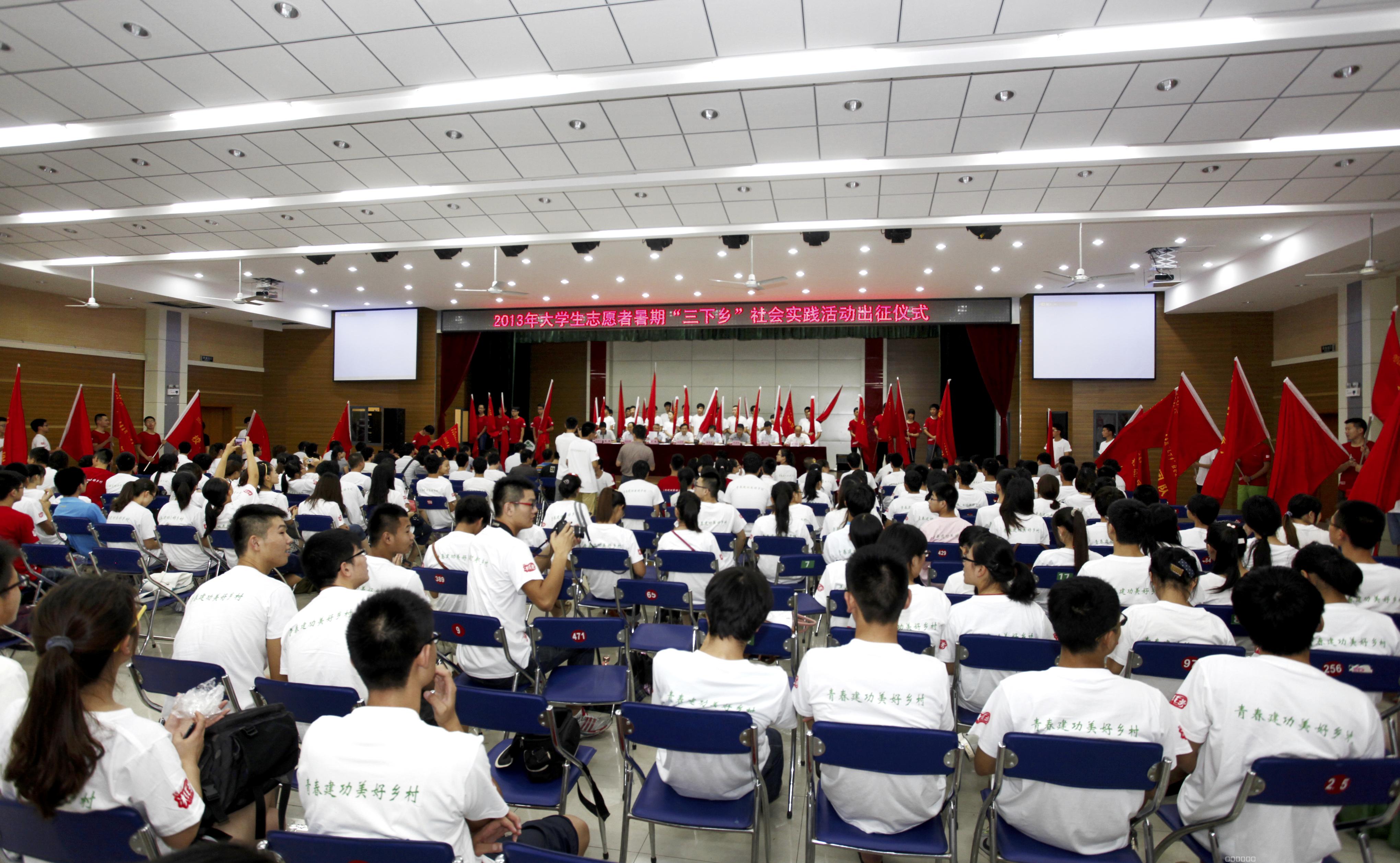 本网讯 7月7日上午,我校2013年大学生志愿者暑期“三下乡”社会实践活动出征仪式暨美好乡村建设调研培训在学生活动中心多功能厅举行。各团队代表从主席台领导手中接过社会实践的旗帜,意味着全校125支团队1600余名师生将陆续分赴省内12个城市、28个县城和45个乡镇近百个村庄以及省外7个市县开展以“青春建功美好乡村”为主体的社会实践活动。