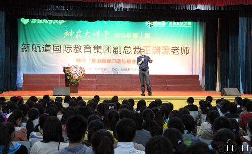 本网讯 4月19日晚,新航道国际教育集团副总裁王渊源先生做客我校2013年第1期“神农大讲堂”,与千余名师生相聚一堂,体会巅峰口语,分享职业规划经历。