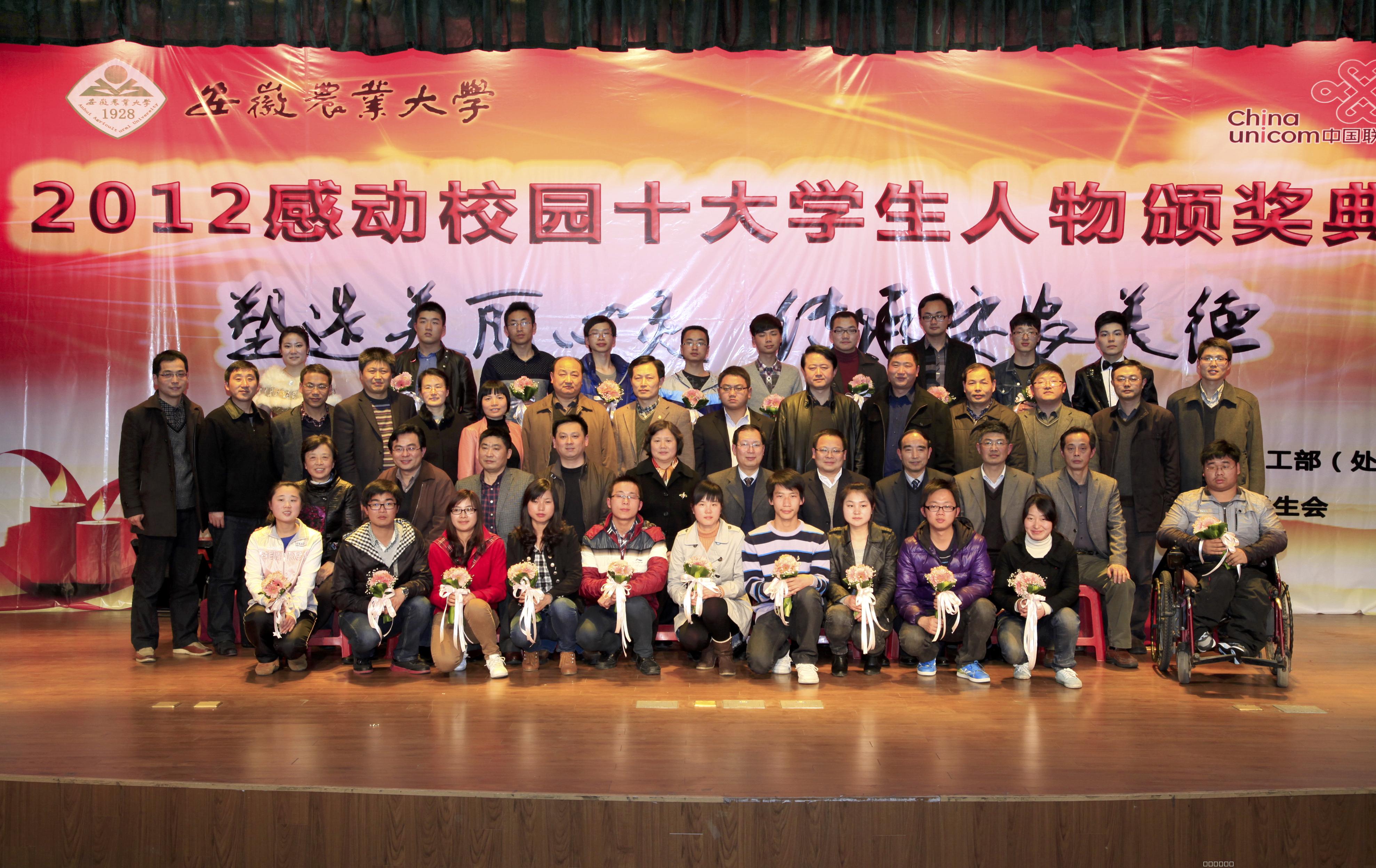 本网讯 3月27日晚上7:00,我校2012年度感动校园十大学生人物评选活动颁奖典礼在欣苑四楼学生活动中心多功能厅隆重举行,历时一年的评选活动圆满落幕。校党委书记赵良庆、校党委副书记王华丽、副校长程备久、合肥联通常务副总经理黄丛新,校办公室、纪委、组织部、宣传部、学生处、招生就业处、团委等部门负责人及各个学院党委负责人出席并担任颁奖嘉宾。700多名学生及各学院团委老师观看了颁奖典礼。