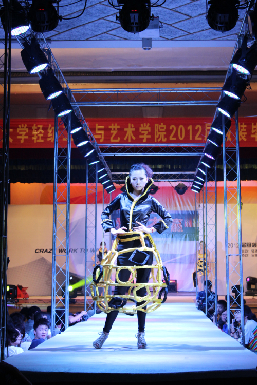 本网讯 在这烈日炎炎,活力四射的季节里,安徽农业大学轻纺工程与艺术学院于6月11日下午在农大礼堂举办了“爱‘拼’才会赢”2012届服装毕业设计作品汇演。本届共有22套优秀设计作品参赛,华服的炫动透过以“拼”为主的理念与惊艳全场的模特走秀完美的呈现了出来。