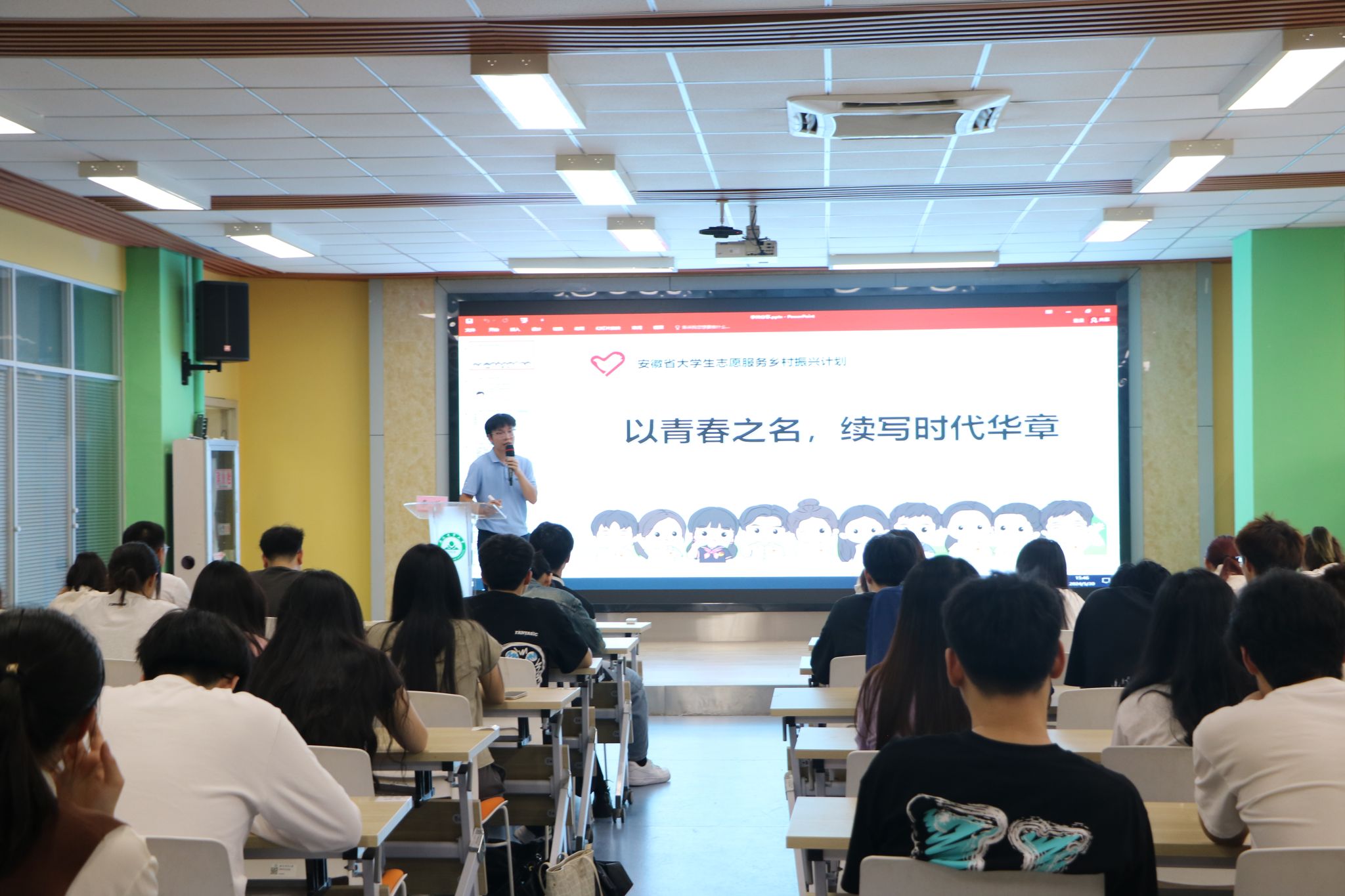 活动中,李帅以“以青春之名 续写时代华章”为主题,向参会同学们详细介绍了大学生志愿服务西部计划的项目内容、报名方式和重要意义等。结合自身在安徽省肥西县乡村振兴服务实践的经历,他进一步向参会同学介绍了安徽省大学生志愿服务乡村振兴计划,鼓励同学们在校期间要积极投身到志愿服务的实践中,以志愿者为榜样,不断加强专业学习、提升能力本领、做好职业规划,学会“自找苦吃”,主动到基层和人民中去建功立业,让青春之花绽放在祖国最需要的地方。
