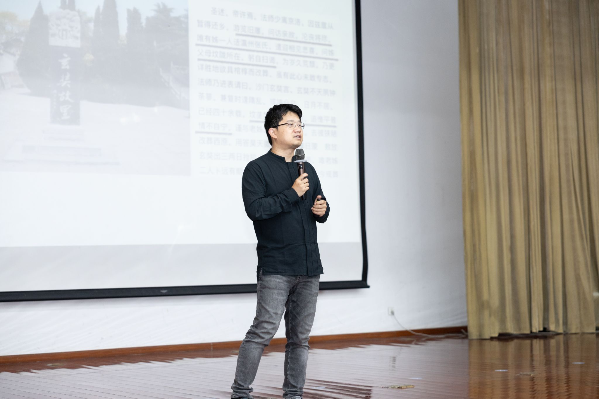 “历史”是马伯庸写作的起点,也是贯穿其文学创造的线索。如何让历史与现实有效的结合,找寻现代人的情感与价值共鸣,是他一直思索与实践的方向。从敦煌文书到睡虎地秦墓竹简,从铭文砖到古壁画,马伯庸以风趣幽默的语言,以自身置于现代社会的体悟为切入点,娓娓道述着历史中小人物的生活细节和情感表达。“写作就是讲故事”“讲好故事就是要找到共鸣”,马伯庸以玄奘高僧的故事为例,与同学们分享口述历史、传播历史思维范式。“50岁的玄奘与唐高宗出差,途中路过玄奘的老家洛阳偃师。当玄奘亲眼看到物是人非场面后留下八字:‘追惟平息,情不自宁。’与印象中超脱现实的玄奘高僧形象有所不同,事实上,个性坚强的他依旧保留了十岁出家前对父母的思念,亲情就是古今人们内心之中最牢固、最可靠、最富有价值链接的情感体验。”秦灭楚之战的竹简家信、战火纷飞之中手足兄弟的深情……一个多小时的讲座在一个个历史故事、细节的串联中生动、立体而风趣精彩。