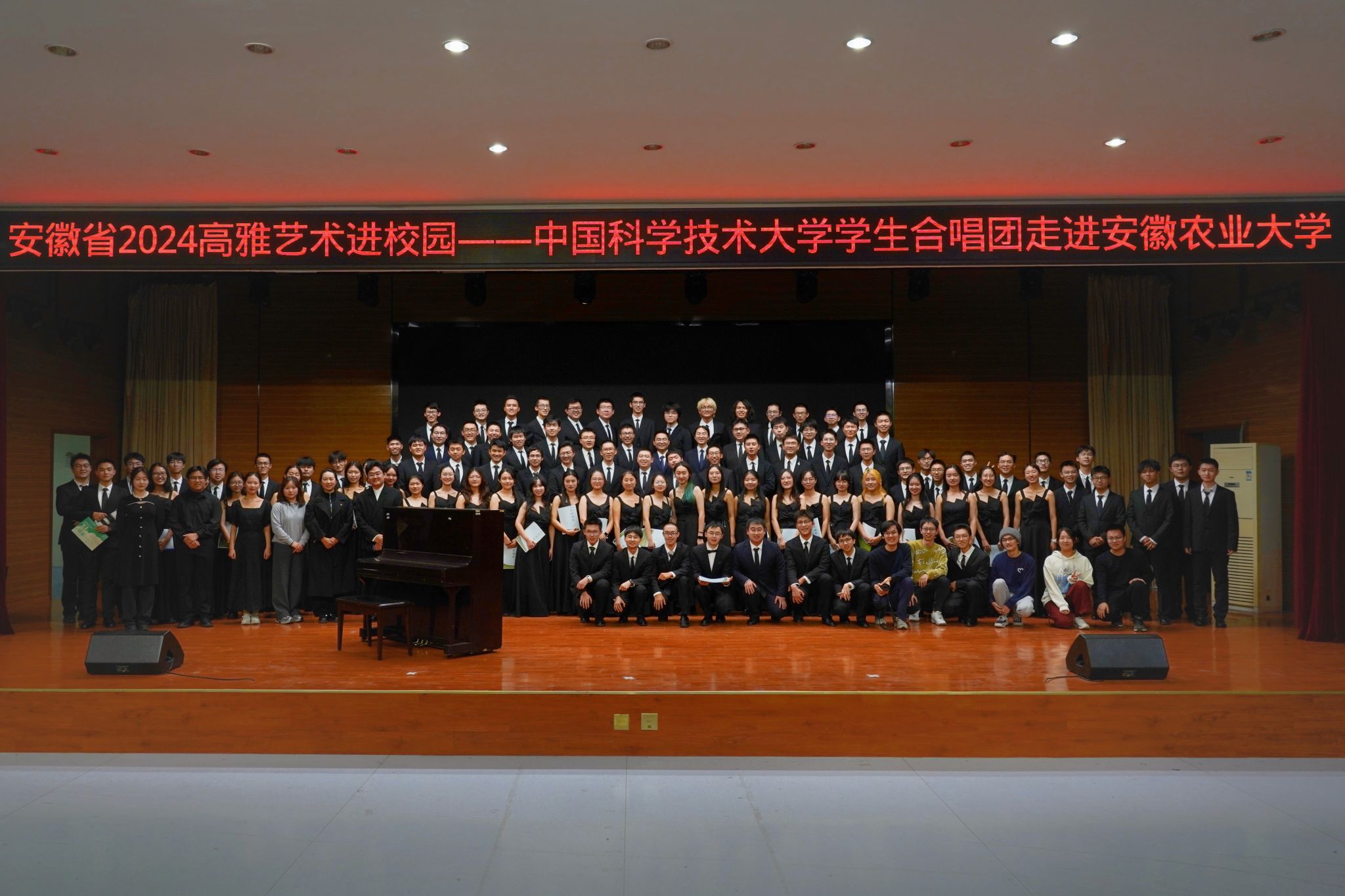 音乐会中场,我校大学生合唱团上台演唱了《四季的问候》,并与中国科学技术大学合唱团共同演绎了我校校歌。