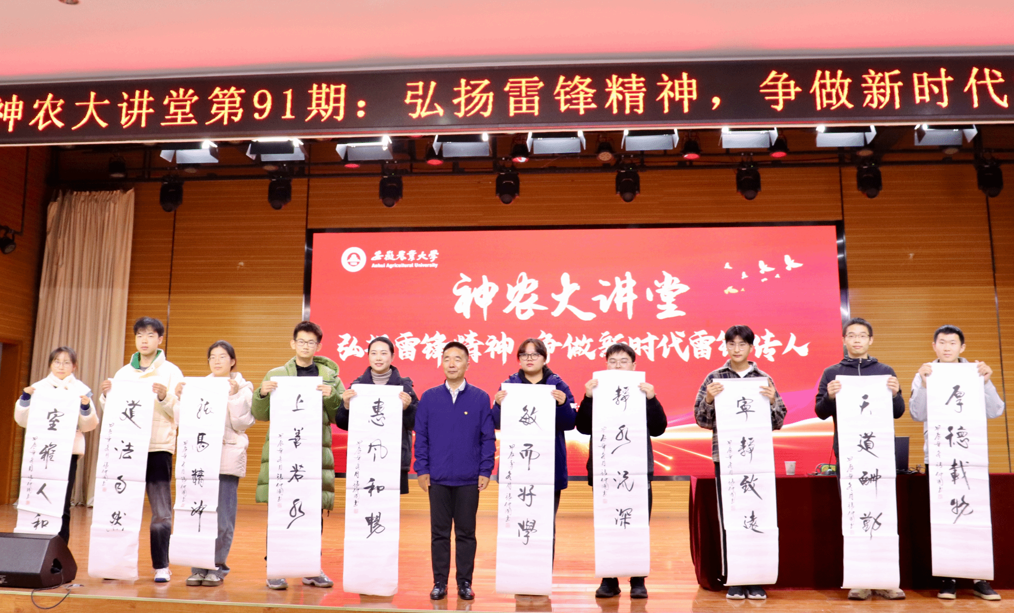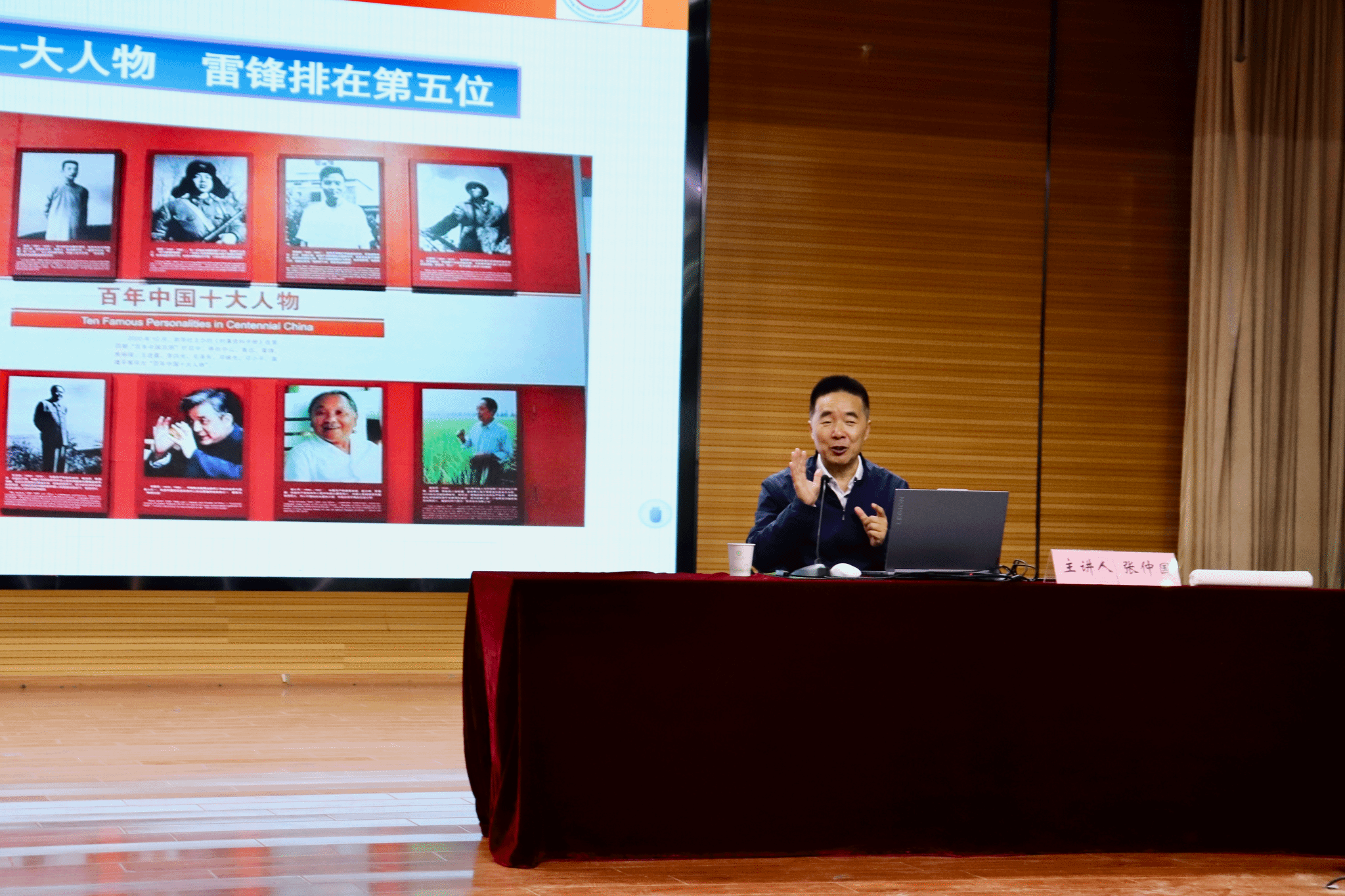 张仲国教授围绕“知雷锋”“学雷锋”“做雷锋”三个方面,分享了自己多年来研究雷锋精神与学习践行雷锋精神的成果、收获与感悟。他追寻着雷锋的足迹,走访雷锋生前的领导、亲人、战友和帮助过的人,收集整理了大量雷锋的照片、文字、相关报道、领导人题词和事迹等珍贵资料,为我们还原了一个真实的、可亲可敬的雷锋,深刻诠释了雷锋精神的丰富内涵和时代价值,教育引导广大青年学生弘扬雷锋精神,争做新时代雷锋传人,以实际行动传承雷锋精神,让雷锋精神在心中生根发芽,茁壮成长。在讲座中他不时穿插着歌唱和诗朗诵,辽阔浑厚、字正腔圆的声音,极具感染力,赢得了现场师生们的阵阵掌声。讲座结束后,他向与会师生赠送了他的书法作品。