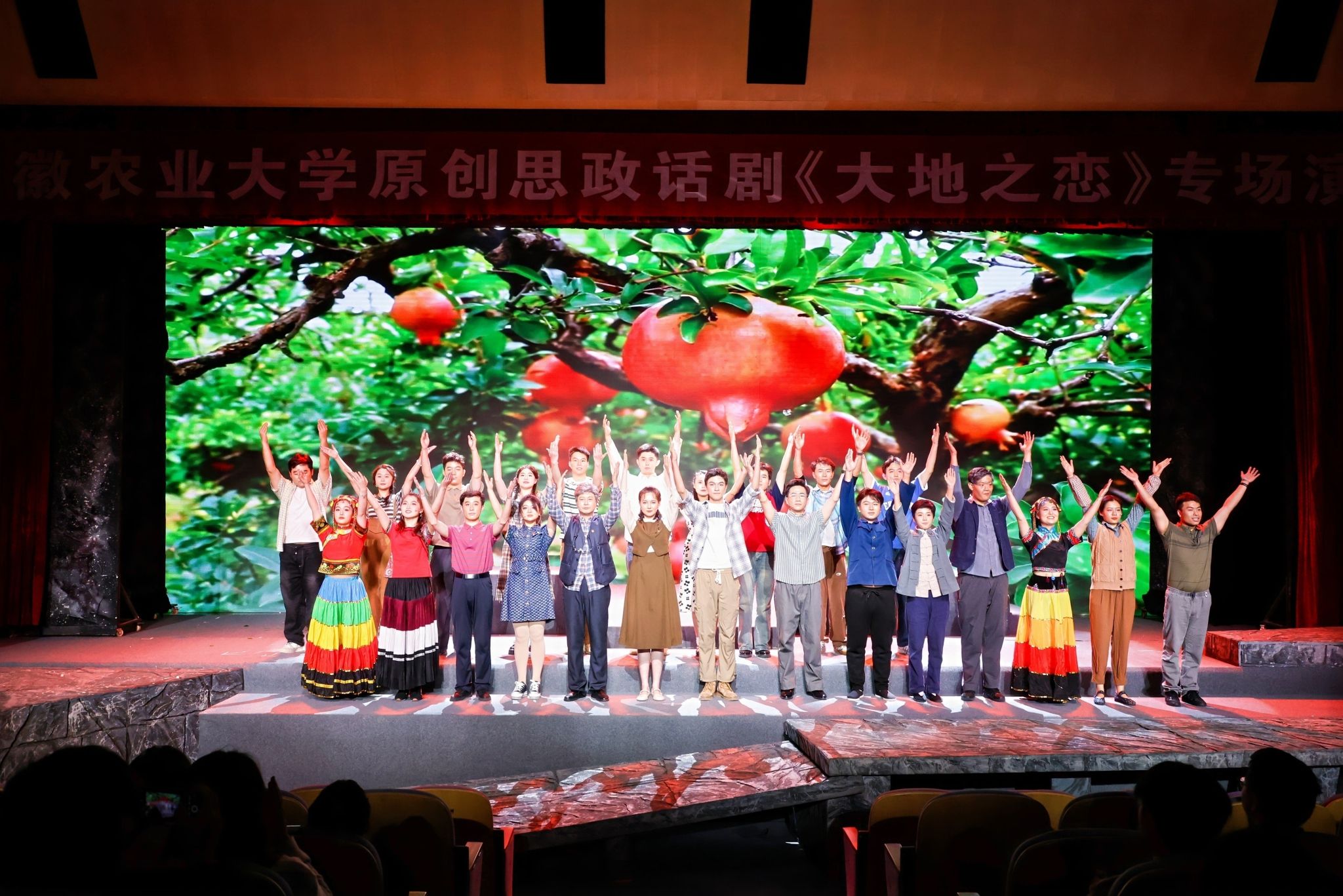 《大地之恋》是我校倾力打造的原创思政话剧,该剧充分挖掘学校发展历程、重要事件以及人物故事,以“大别山道路”为题旨,围绕安农师生建校以来服务“三农”和安徽经济社会发展这条主线,全方位、立体化、多形式地再现了安农大老中青三代扎根农村基层、助力乡村振兴的奋进故事,充分诠释了安农师生坚守强农兴农初心、勇担乡村振兴使命、奋力建设农工商融合发展的特色高水平大学的铮铮誓言。