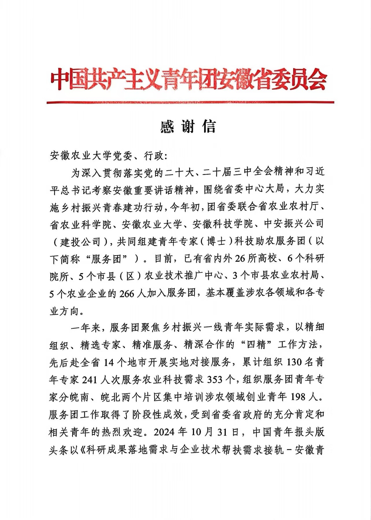 科技是第一生产力、人才是第一资源、创新是第一动力,学校深耕科技创新育人平台,积极探索完善大学生科技创新服务乡村振兴工作体系,引领广大青年学生永攀科学高峰、投身科创报国。一是扎实开展科技小院建设。学校秉持“一线建小院,小院筑大院”的理念,在全省16个省辖市、61个县区设立122个科技小院,2023年全校247位教师和321位研究生进驻科技小院,共联系服务114个农技协、开展培训会315场、培训农民12529名,有力服务“三农”工作。二是组建青年专家科技助农服务团。学校积极配合全省“千村引领、万村升级”工程,充分发挥高校青年专家(博士)在科技强农中的积极作用,广泛宣传、有力组织,动员72名青年专家加入全省“青年专家(博士)科技助农服务团”,深入全省基层一线提供科技助农服务,目前,第一批“助农团”的11名成员已经前往六安裕安区开展精准对接帮扶。三是广泛开展大学生科技创新实践。以竞赛为引领,组织开展“挑战杯”“兴农杯”“爱农杯”“青苗杯”等科技创新竞赛,每年累计参与人次5000余人,不断提升大学生科创素养;以创客空间为平台,组织学生开展科技创新创业实践,目前创客空间入驻20支创业团队,团队通过创业实践,推进更多成果转化与落地,培养科技创新实践能力,有力服务乡村振兴。