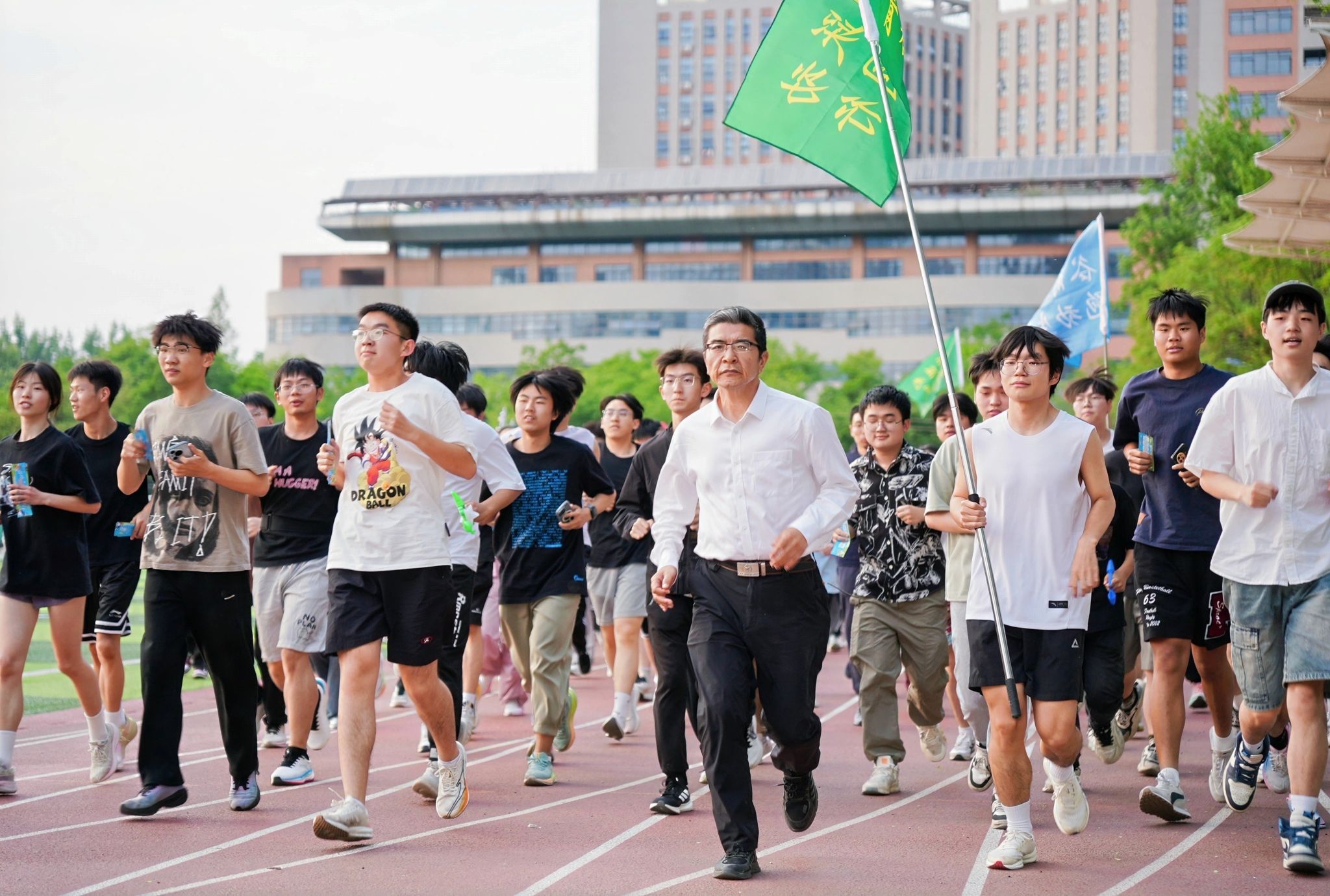 为传递健康的生活理念,激发运动活力,让更多同学在运动中感受幸福、在奔跑中收获成就,在经过充分的热身活动后,五百余名师生沿规定路线开启了“谷雨健康跑”。大家头戴荧光发箍,挥动着荧光棒,从第一运动场出发,经过勤政楼、图书馆、大礼堂等校内“打卡点”,开启跑步健身之旅。夜幕降临,同学们踏着轻快的步伐,在跑道上挥洒汗水、释放活力,展现出新时代青年朝气蓬勃、奋发向上的精神面貌。