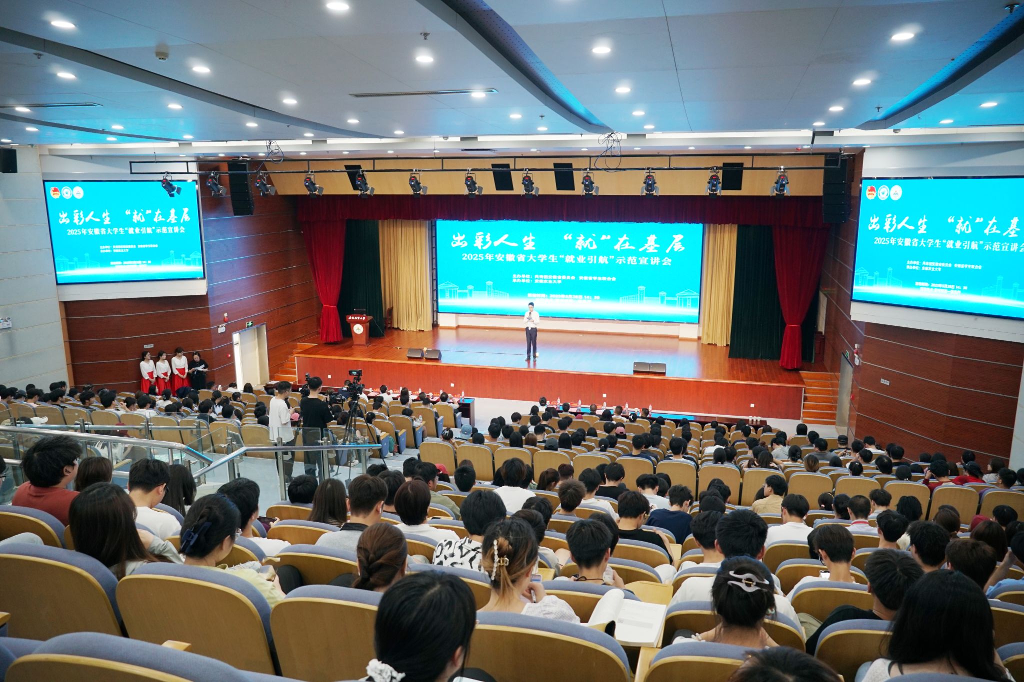 本网讯 为深入学习贯彻习近平总书记关于促进高质量充分就业的重要指示精神,深化实施共青团服务和促进大学生就业行动,进一步引导大学生树立正确的择业观、就业观、劳动观,不断涵养“自找苦吃”的精气神。5月28日下午,“出彩人生 ‘就’在基层”2025年安徽省大学生“就业引航”示范宣讲会在我校举行。团省委副书记周宇、校党委常委、副校长李红、团省委学校部二级调研员汪文斌,以及我校相关部门负责同志、2026届学生代表等500余人参加了活动。