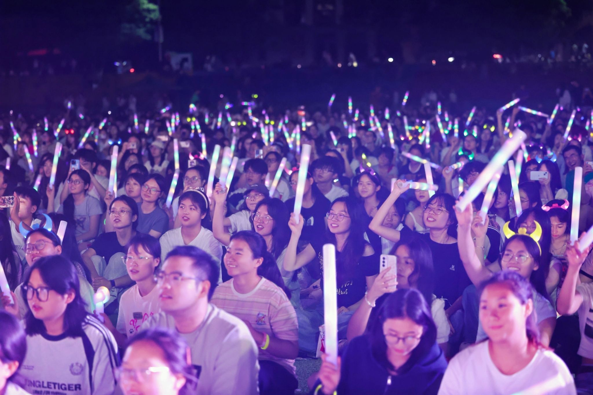 音乐节在晚霞中拉开帷幕,师生们在草坪上席地而坐,共赴这场音乐盛会,共同享受音乐与青春的热情。伴随着《海阔天空》《一路向北》的开场乐队演出,音乐节拉开序幕,《父亲写的散文诗》《世界赠予我的》《等你下课》《凤凰花开的路口》《我们的明天》……同学们用歌声勾勒青春的轮廓,以旋律编织未来的蓝图,在星光与乐声交织的夜晚,为每一位即将奔赴人生新征程的学子,送上最炽热的祝福与力量。现场灯光闪烁,荧光棒挥舞,欢呼和掌声此起彼伏,大家尽情享受着音乐带来的激情与快乐,他们用热情尽情展现青春的活力,诉说着对未来的无限期许。