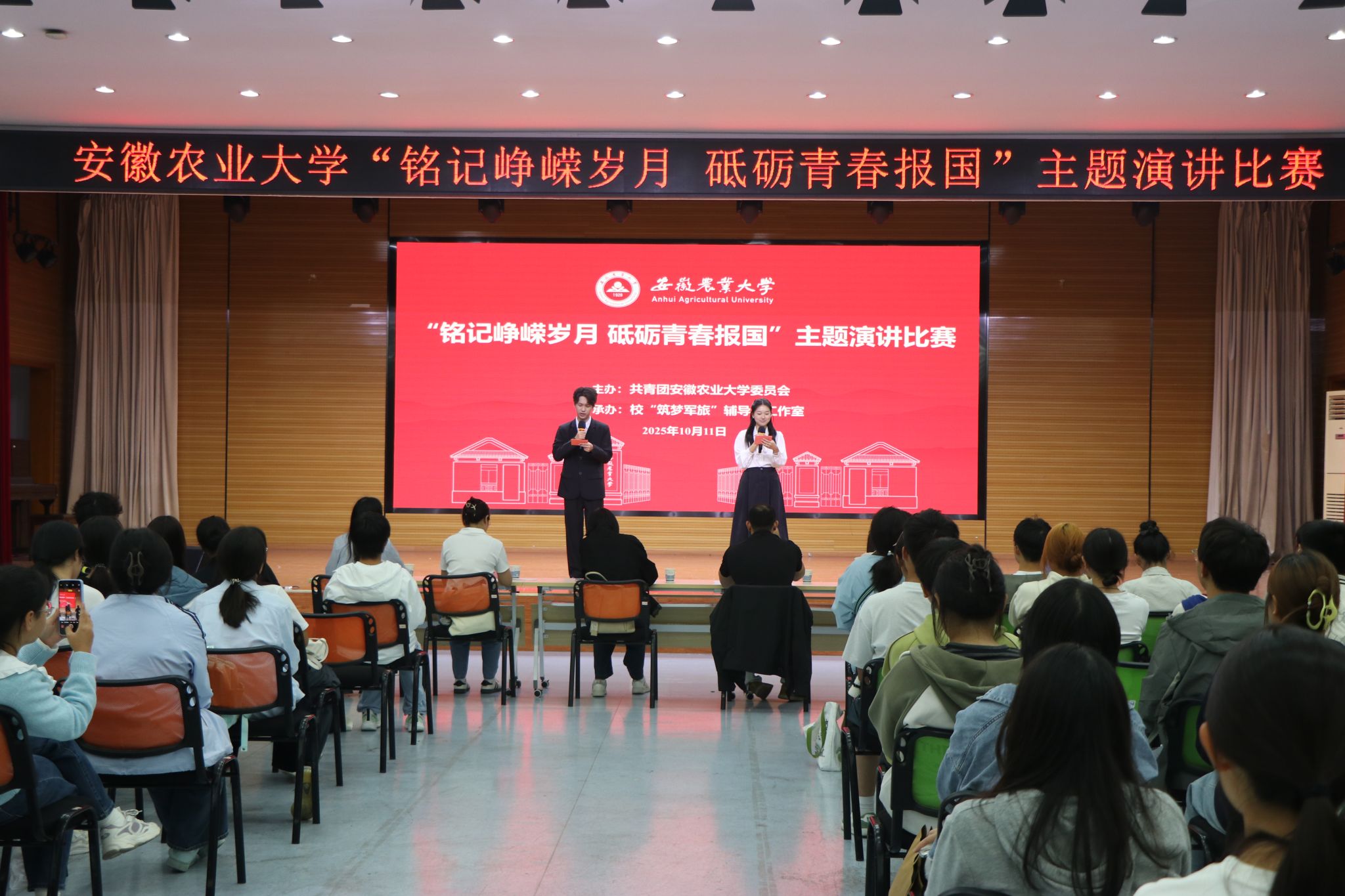 决赛现场,选手们围绕“铭记峥嵘岁月 砥砺青春报国”这一主题,结合抗战历史、红色江淮、皖美青春、实践实习、科技创新、好城好房等内容,以饱满的热情、生动的语言和真挚的情感,讲述革命先辈的英雄事迹、家乡文化的深厚底蕴、实践成长的感人故事、科技创新的时代强音,展现了新时代安农学子昂扬向上的精神风貌与使命担当。经过激烈角逐,信息与人工智能学院2025级智能科学与技术专业潘卢艺同学荣获一等奖,外国语学院2025级英语专业范译之等3名同学获得二等奖,马克思主义学院2024级马克思主义理论专业庞曼婷等4名同学获得三等奖,动物科技学院2025级水产养殖学专业梁修羽等4位同学获得优秀奖。