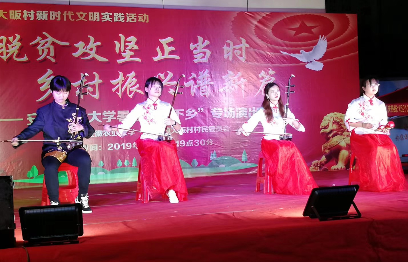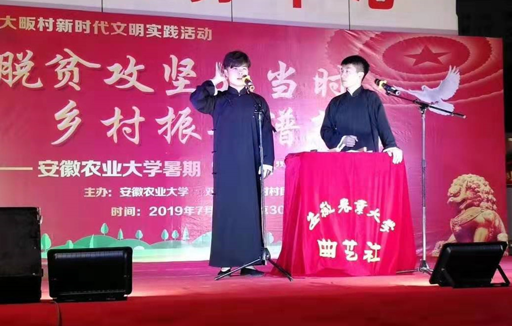 本网讯 7月10日晚,我校学子走进定点帮扶贫困村金寨县大畈村,开展以“脱贫攻坚正当时 乡村振兴谱新篇”为主题的暑期“三下乡”专场文艺演出活动。校团委、轻纺工程与艺术学院、我校驻大畈村扶贫工作队全体成员,金寨县、双河镇相关部门领导及大畈村村民400余人共同观看演出。金寨在线全程直播本场晚会,吸引了4.98万余人在线观看。