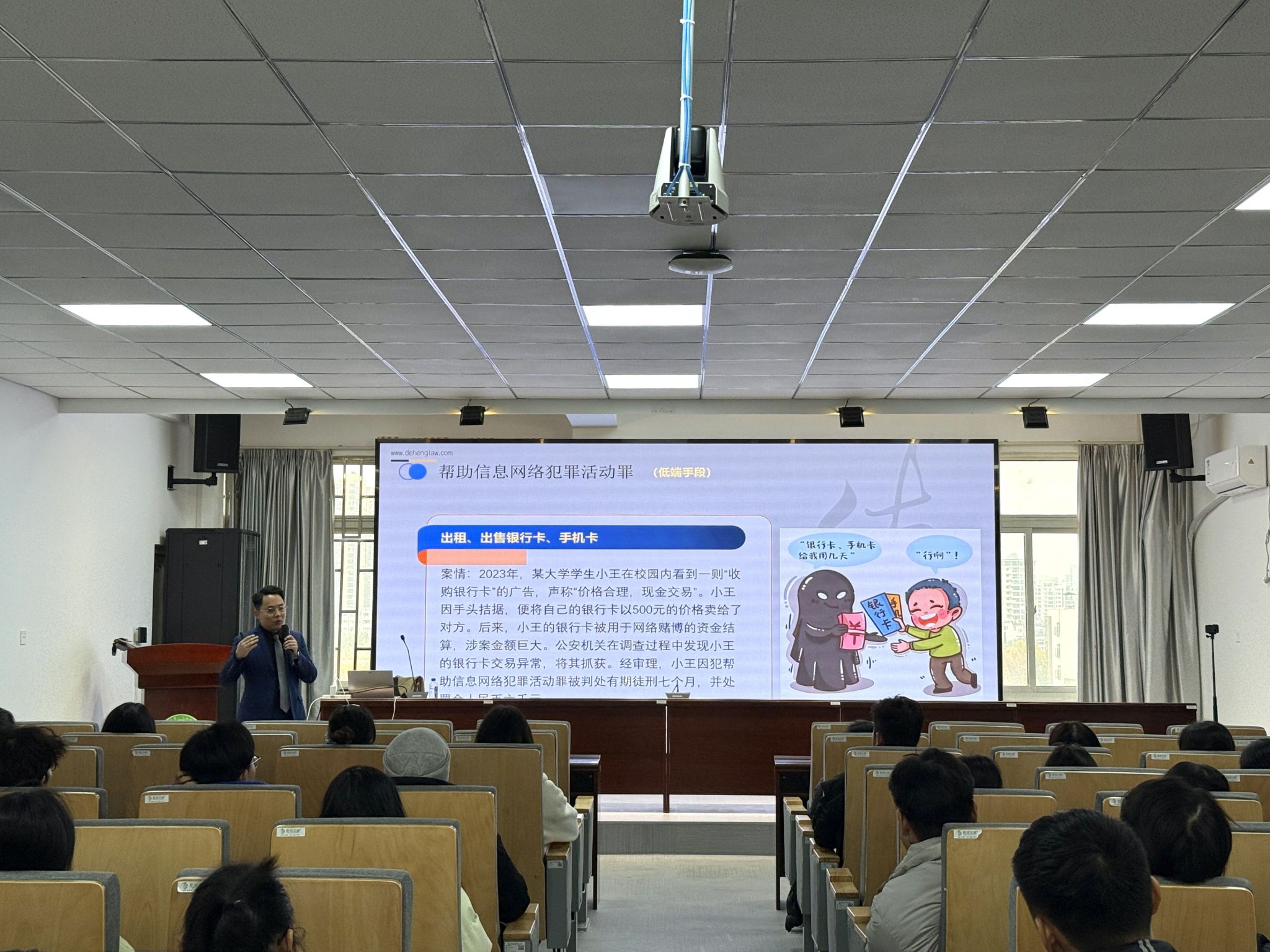 讲座中,林彬律师围绕与大学生活息息相关的法律风险领域,结合真实生动的案例和法条解析,深入浅出地剖析了大学生在网络安全、兼职就业、金融借贷、人际交往等方面可能遇到的法律陷阱,并强调大学生从校园到初入职场工作的整个过程中,务必要提高警惕,防患于未然,要学会运用法律武器保障自身合法权益。最后,林彬律师结合自己的大学生活与工作经历,与同学们共话校园成长的感悟、职业选择的初心和法治实践的路径,鼓励同学们要保持求知热忱,提升法治素养,以青年之智守护公平正义,以青春之力护航法治中国建设。