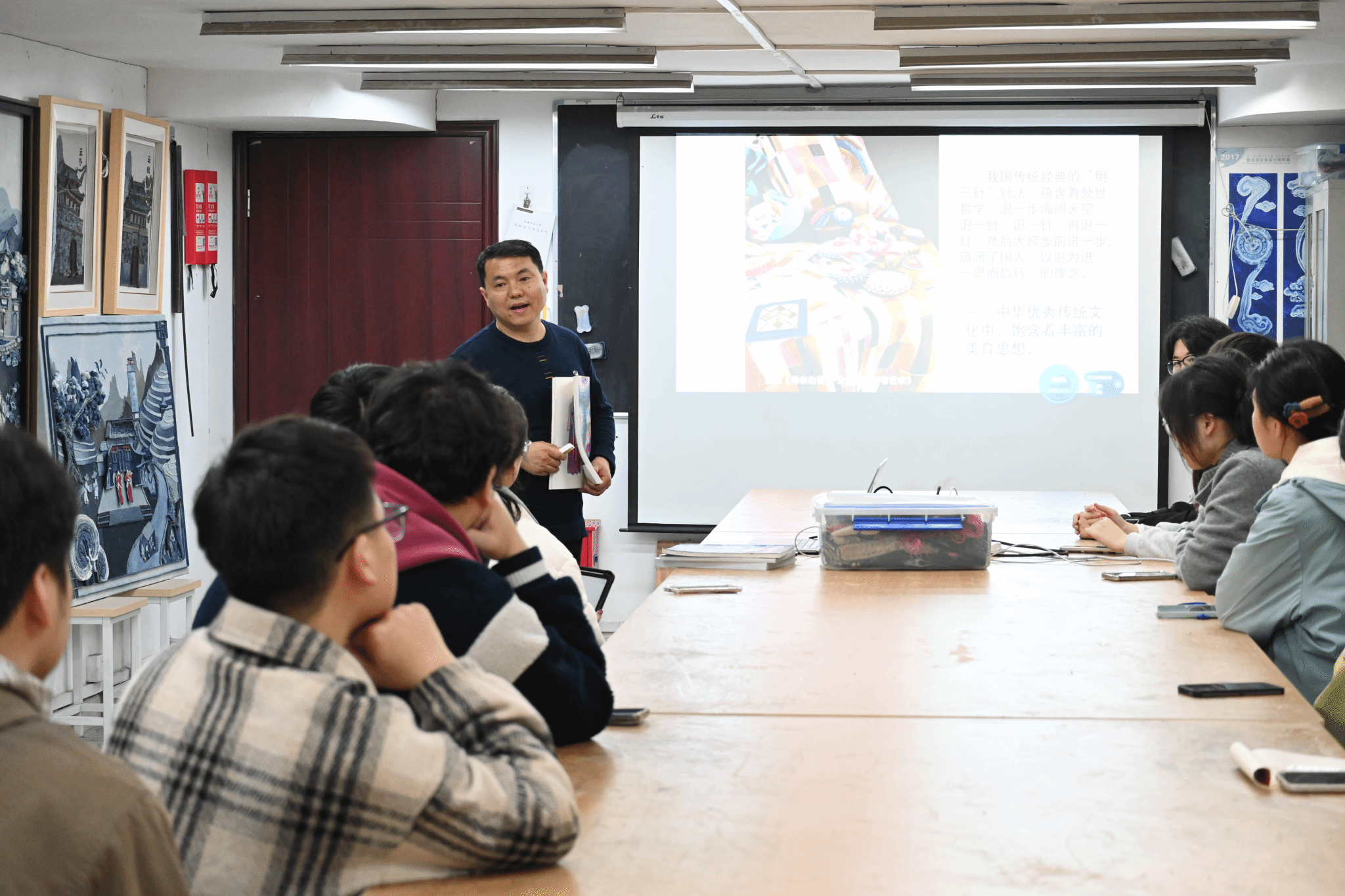 课堂上,授课老师系统讲解拼布艺术的起源演变、风格分类与制作技法,结合经典作品解读工艺精髓与文化底蕴。同学们通过沉浸式赏析与观摩,近距离感受传统手工艺的温度,在针线穿梭、布料拼接中领悟美学真谛、体悟匠心精神。大家纷纷表示,此次课程打破了对拼布艺术的粗浅认知,既学到了专业知识,也激发了探索传统手工艺术的兴趣。
