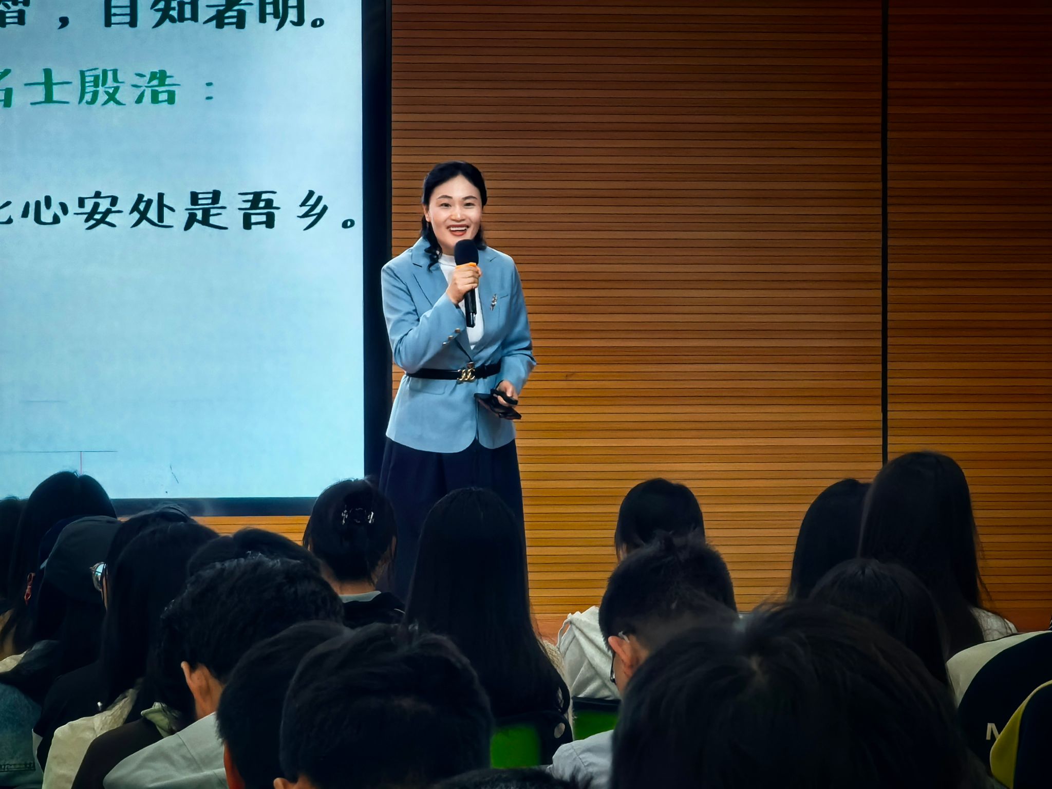 报告中,桂芳结合自身三十余年从教经历,从“与西西弗斯并肩”的教育坚守,到“风雨同舟的小家”的温情相伴,从“每一次鲜花怒放”的育人欣喜,到“心为大家系社会”的师者担当,用一个个鲜活故事、一段段真挚感悟,生动诠释了“以爱为名奔赴人山人海”的深刻内涵。她特别提到语文教育对人格塑造的浸润作用,结合参与编写的人教版选修教材《中国古代诗歌散文欣赏》篇目,带领现场师生感受中华优秀传统文化的魅力,勉励同学们珍惜大学时光,多读经典、勤于思考,在书香中涵养家国情怀。
