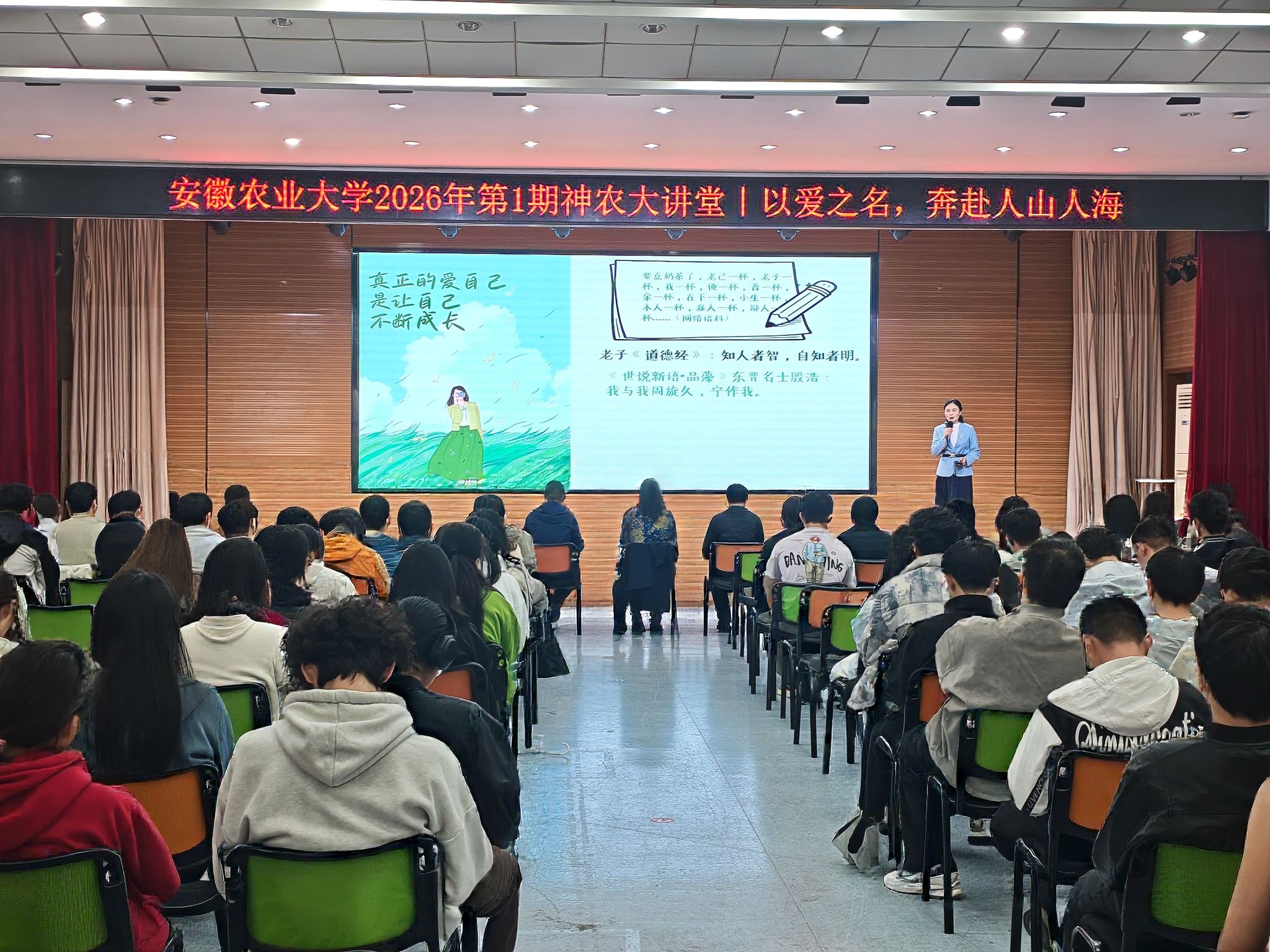 本网讯 4月3日下午,2026年第1期“神农大讲堂”在欣苑四楼大学生活动中心顺利开讲。全国先进工作者、国务院津贴专家、国家知名专家、马鞍山市红星中学语文正高级教师桂芳应邀作题为《以爱为名,奔赴人山人海》专题报告。全校近300名师生到场聆听,感受爱与阅读交织、实践与理想共生的精神盛宴。
