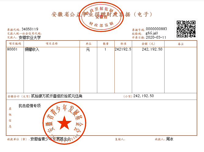 3月2日-9日,仅仅7天,全校571个团支部7916名青年团员积极参加爱心募捐活动,募捐金额达24.21925万元,募集到的资金全部以安徽农业大学团员的名义统一捐赠至安徽省青少年发展基金会“关爱抗疫医务人员子女”专项基金、“关爱因疫致困青少年”专项基金,向奋战在抗疫一线的医务人员致敬,为他们的子女提供关爱;向因疫情致困、返贫家庭的青少年学生提供助学金,帮助他们解决实际困难、顺利完成学业,传递党的关怀和社会主义大家庭的温暖。