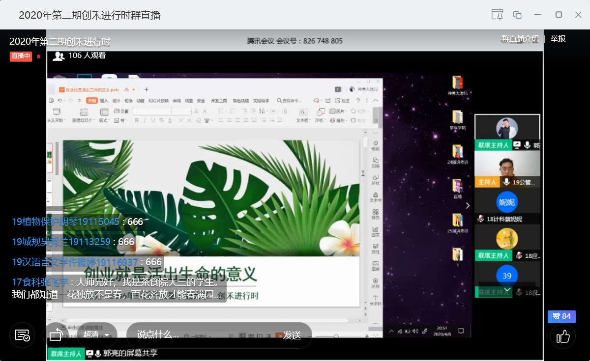本网讯 4月8日晚,我校校友、梦享学院创始人郭亮先生做客我校2020年第2期“创禾进行时”,通过线上直播的方式为广大创客带来了一场以“创业就是活出生命的意义”为主题的分享会。我校团学工作相关老师、2020年校“青马工程--菁穗领航计划”学习班全体成员以及广大创客共400余人参与了分享会。