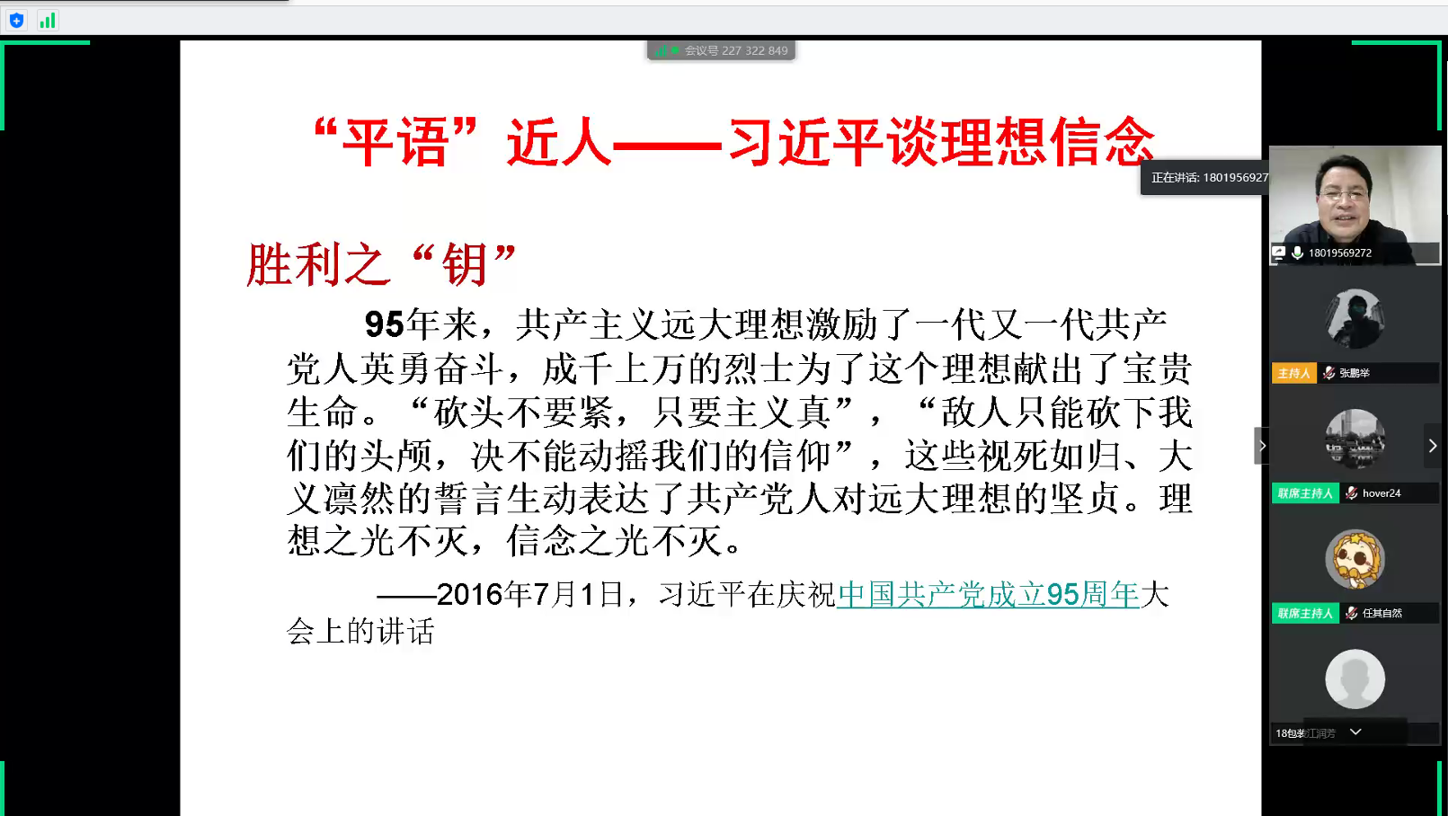 本网讯 4月10日晚,我校“青马工程-菁穗领航计划”学习班理论培训在线上举行,人文社会科学学院党委书记孙超教授为青马班学员带来了一场主题为“树立坚定的共产主义信念”的在线直播讲座,本期“青马工程”全体学员、班主任、指导老师参加了讲座,讲座由校团委副书记任琪主持。