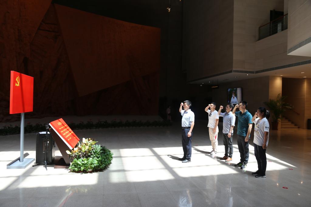 在展厅“胜利之师”雕像下,支部全体党员面对鲜红的党旗,紧握右拳,重温入党誓词,提醒自己不忘初心、牢记使命。