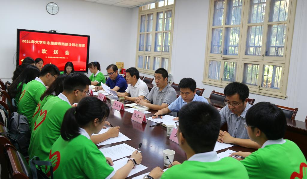 本网讯 6月24日中午,我校在勤政楼134会议室举行2021年大学生志愿服务西部计划志愿者欢送会。校党委副书记裴树东出席了会议。学生处、研究生处、招生就业处、校团委负责人及西部计划研究生支教团成员、西部计划志愿者参加了会议。