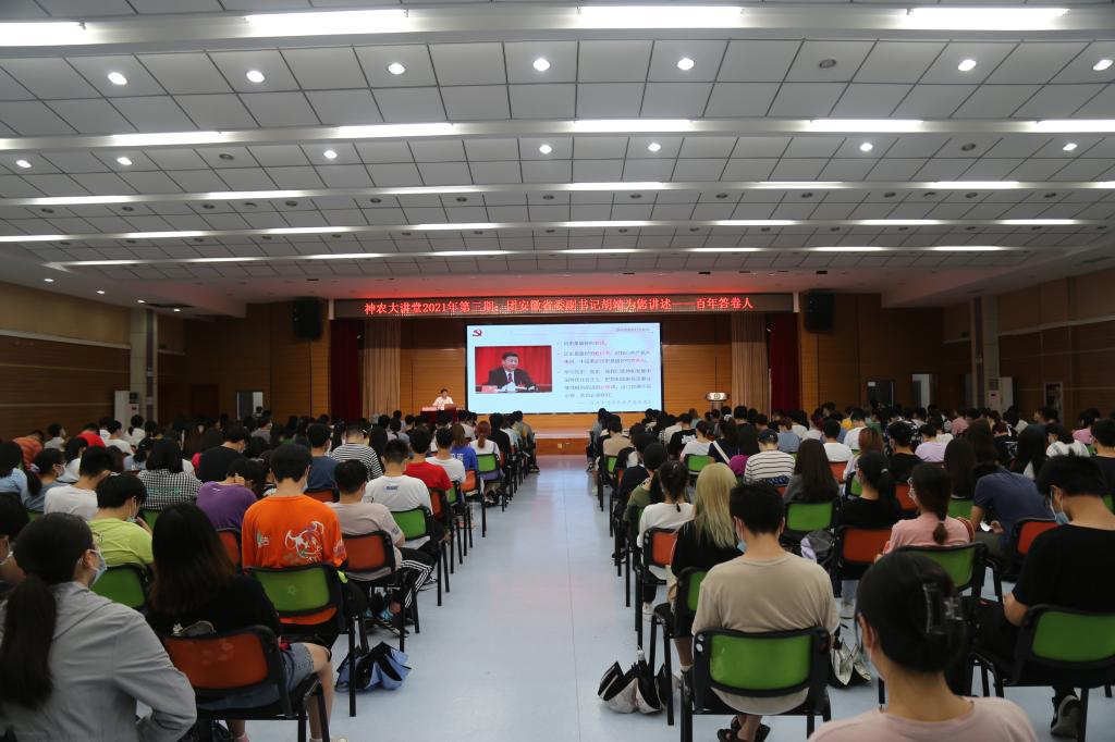 本网讯 6月25日下午,团省委副书记胡靖做客我校2021年第3期“神农大讲堂”,在欣苑四楼学生活动中心多功能厅为我校师生带来了一场主题为“百年答卷人”的精彩讲座,团省委学校部部长卢蓉,校团委书记林煦东及300余名师生一同聆听了讲座。